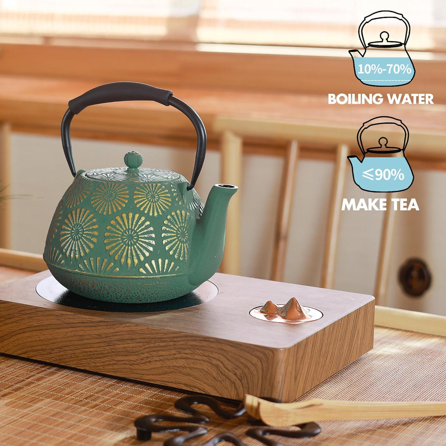 - Cast Iron Material: Crafted from high-quality Australian iron ore, each teapot is hand-finished to create its unique surface texture. The specially selected premium Australian iron ensures better heat absorption, faster heating, and superior heat retention. This exquisite cast iron teapot blends traditional craftsmanship with modern aesthetics.