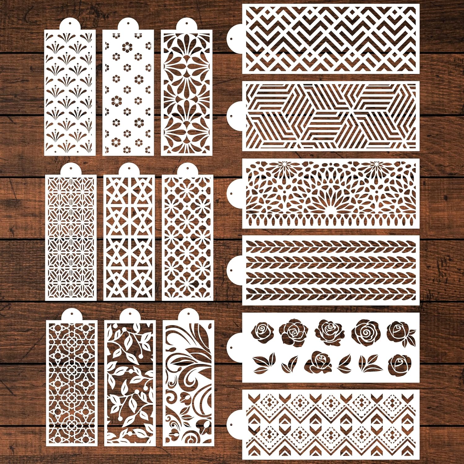 - Reusable Stencils for Baking: This cake stencils set includes 15 pieces of different pattern baking stencils. There are 9 cake stencils for 4.3*10.6 inches, and 6 for 15*6 inches. You can use these cake stencils making buttercream decoration.