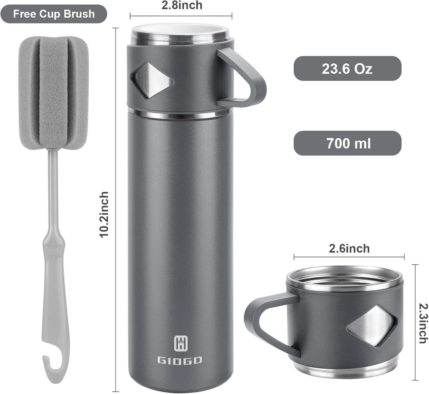 Stainless Steel Thermo 700ml/23.7oz Vacuum Insulated Bottle with Cup for Coffee Hot drink and Cold drink water flask.(Gray,Single)