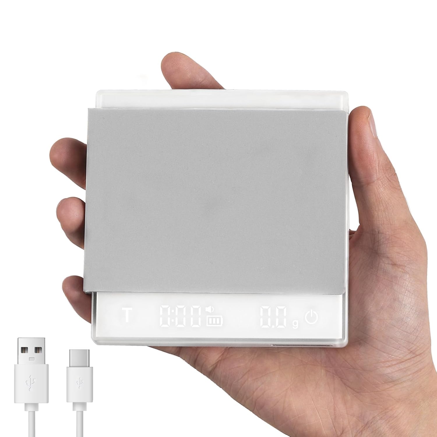 - Thoughtful Design & High-quality Materials: The surface of the professional barista scale is made of ABS plastic, which provides good abrasion resistance as well as easy cleaning.Matched with waterproof and heat-resistant silicone pads.In addition,there is a silicone-protected charging port, mute function, auto shut-off,LED display,and non-slip pad on the bottom, etc.designed to make coffee making more enjoyable.
