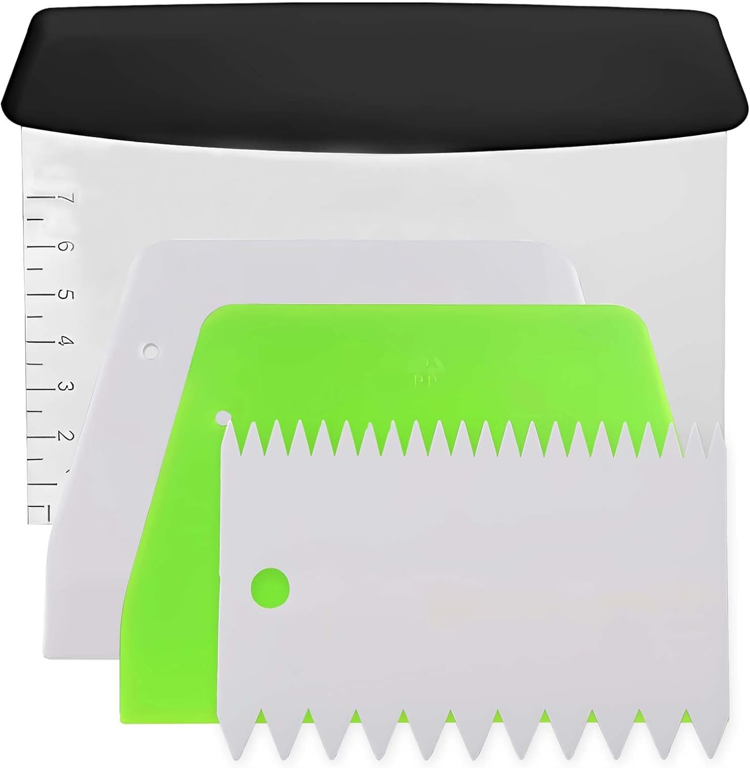 - 1.【Package Includes】You will get 4pcs dough scrapers in one package, including 2pcs soft plastic dough scraper and 1pcs stainless steel bench scraper, 1pcs plastic cake scraper.