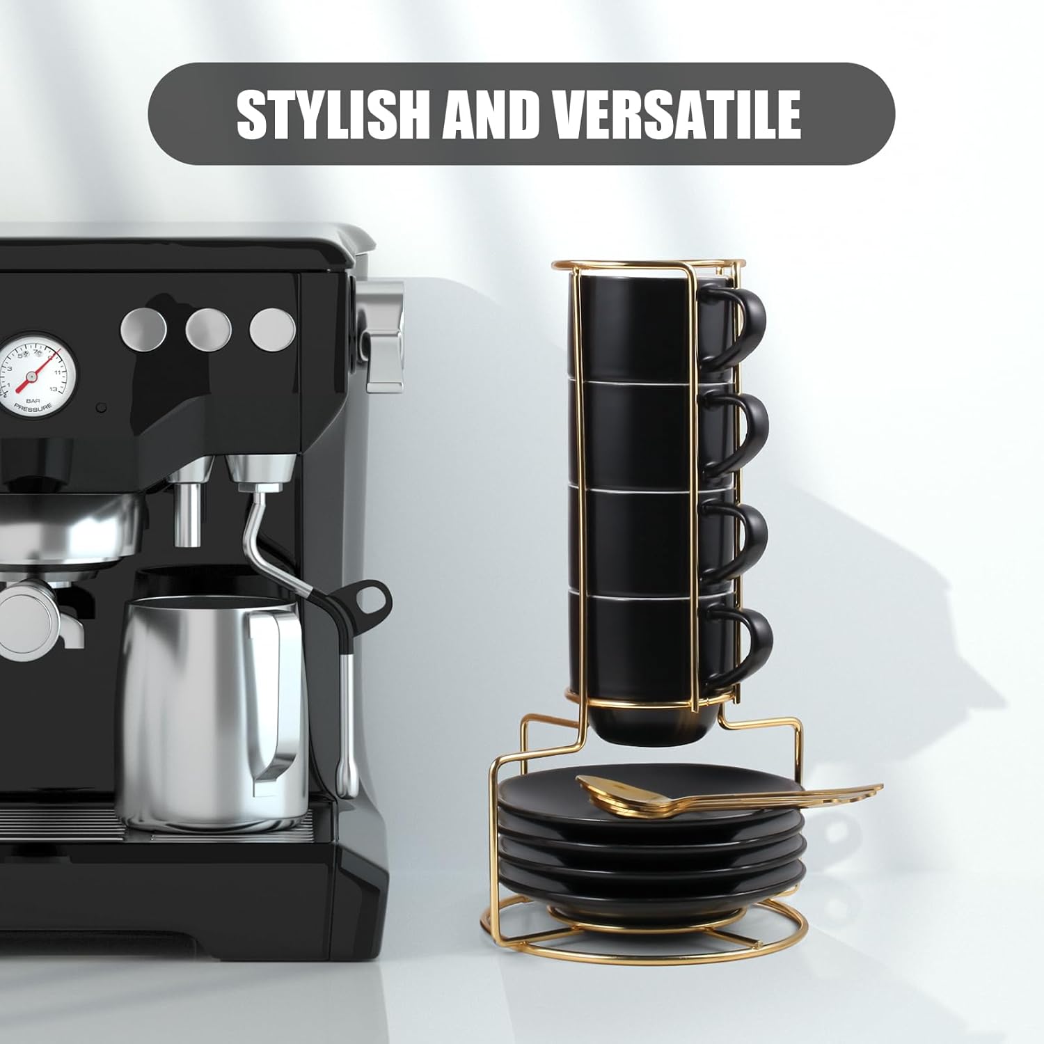 Lareina 3-Ounce Espresso Cups Set of 4, Small Stackable Coffee Cups with Saucers, Spoons and Metal Stand, Ceramic Demitasse Mugs, Espresso Accessories for Machine, Black