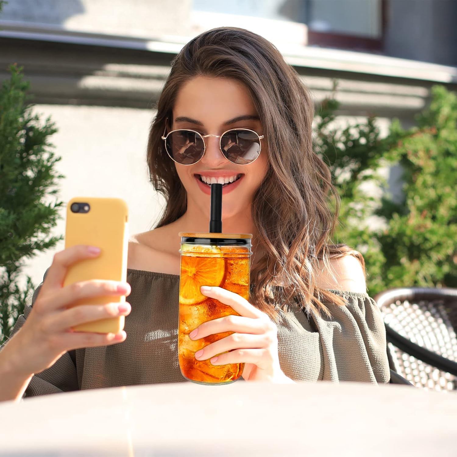 - EVERYTHING TASTES BETTER IN GLASS: Glass the twin pack set wide mouth mason jar drinking glass are made of sturdy durable thick clean tasting glass, comes with 2 sets of glass tumbler, 2 pcs wide stainless steel straw with silicone soft tips extension for safer drinking, 2 pcs natural bamboo lids with silicone barrier, 1 pc cleaning brush. All parts BPA/BPS free