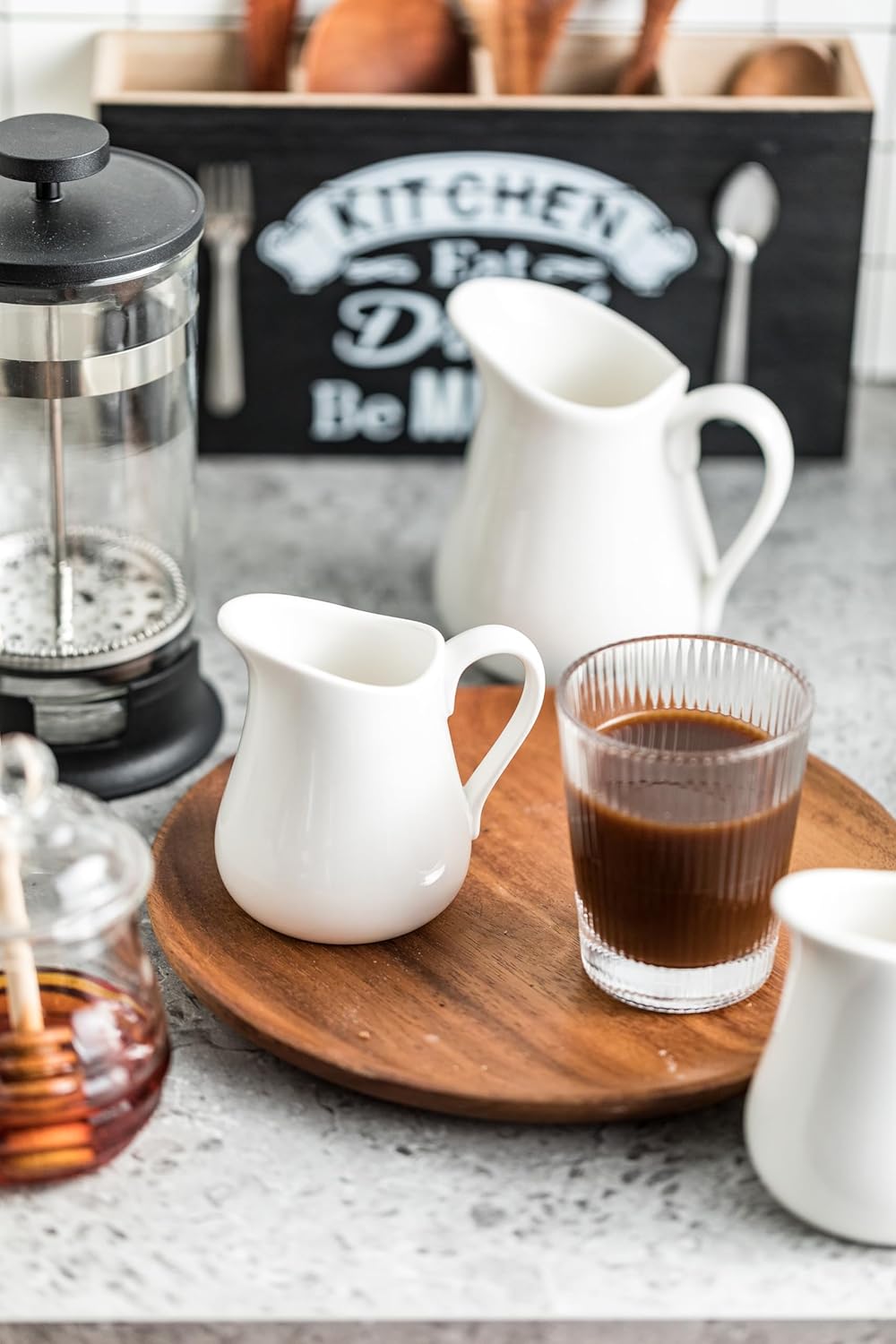 - SAFE MATERIAL: Small creamer pitcher is made of high temperature environmentally friendly ceramic, high quality material and fine workmanship will bring you a comfortable touch. The surface is smooth and translucent, easy to clean. It is also dishwasher and microwave compatible, which brings a lot of convenience to your life