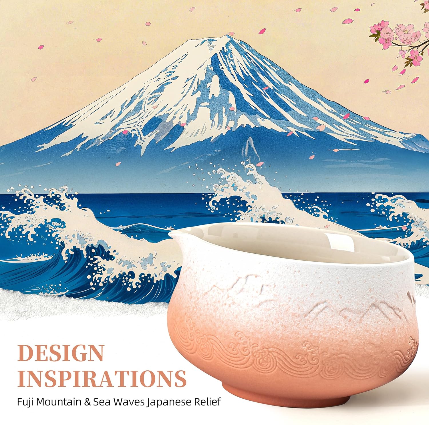 - 7-PCS MATCHA WHISK SET: 1*Ceramic Pink Bowl (chawan) 560 Ml/18.9 Oz, 1*Bamboo Whisk, 1*Bamboo Scoop (chashaku), 1*Cermaic Whisk Holder, 1*Ceramic Scoop Stand, 1*Cotton Tea Cloth (chakin), 1*Matcha Powder Sifter.includes All Accessories