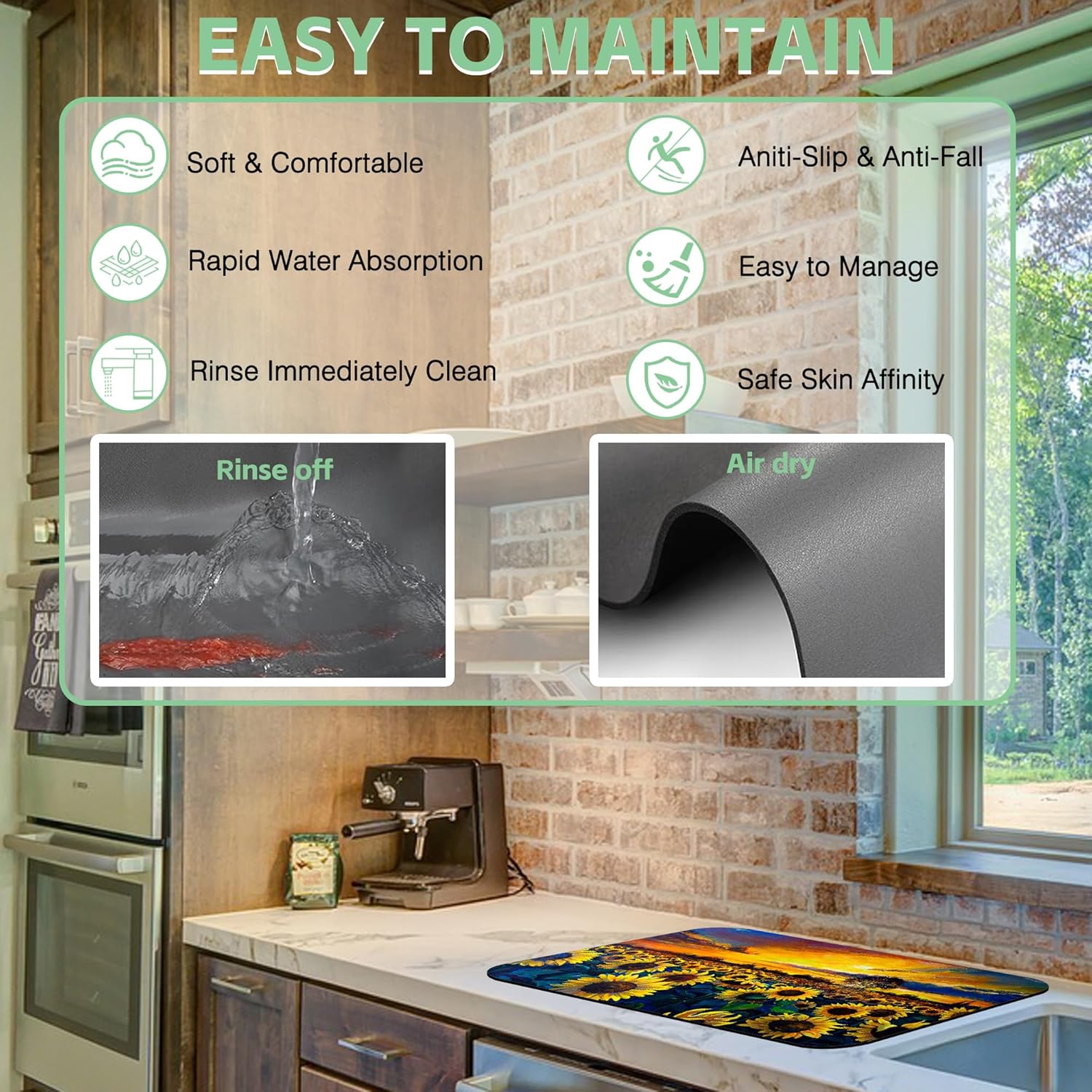 Sunflower Field Dish Drying Mat,16"X24" Absorbent Fast Dish Drying Mat for Kitchen Counter Pot and Pan, Kitchen Accessories