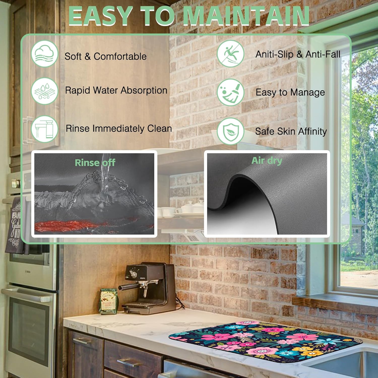 - 【Hide Stains & Easy to Clean】Our dish drying mat, the surface material porosity is up to 85%, which can quickly absorb stains. The dish drying mat can be washed by hand or machine to remove stains, it will not fade after repeated washing, and can be reused many times, due to the high-definition printed suede with excellent color locking effect, please do not use bleach to clean the mat.