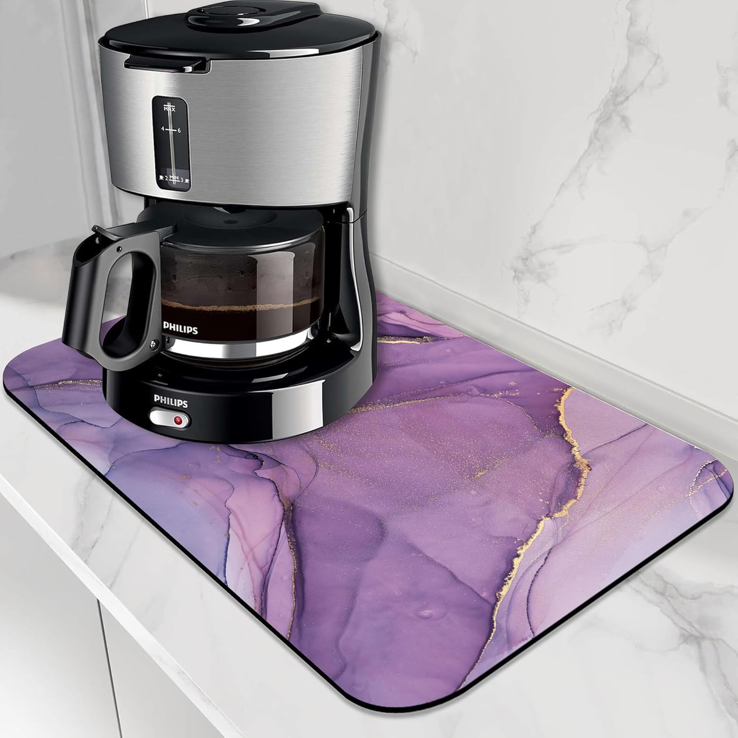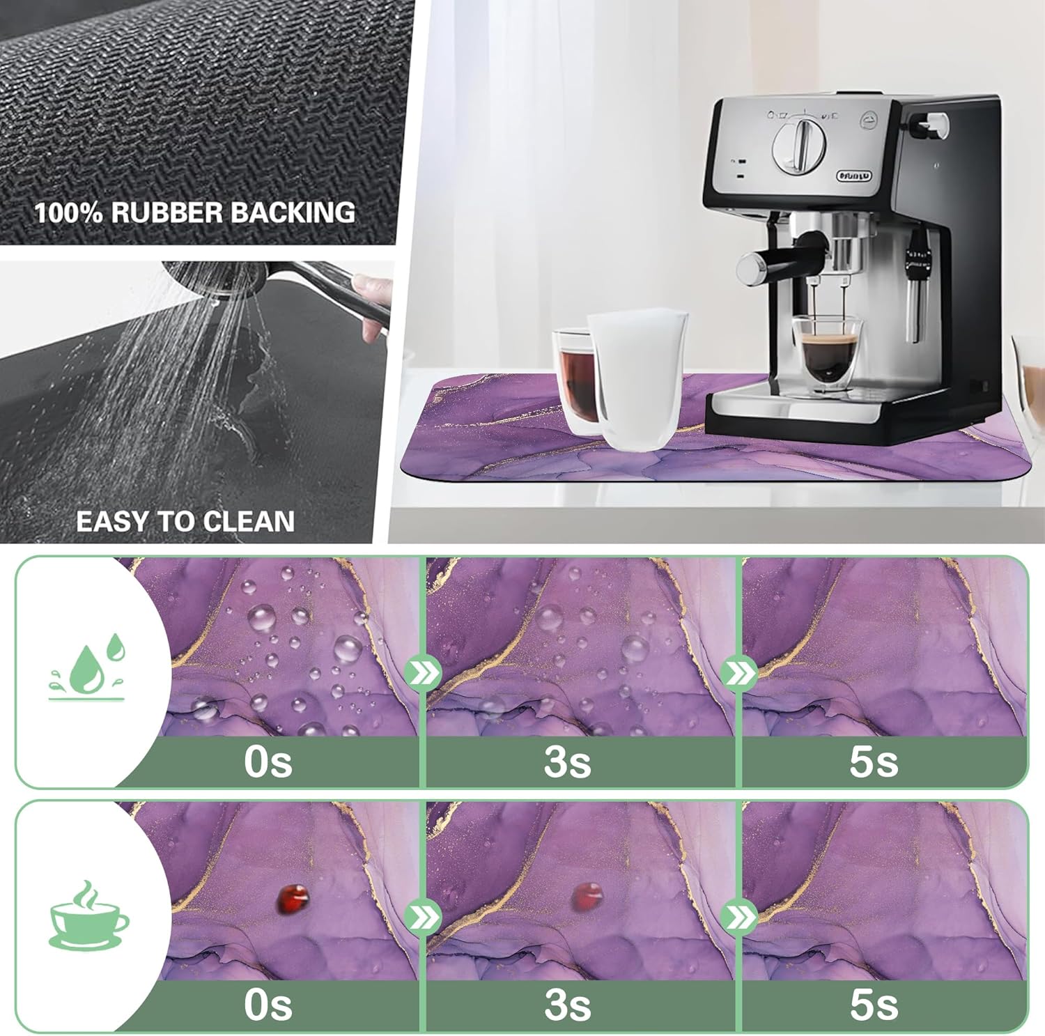 - 【Super Absorbent and Non-slip】The dish drying mat is made of absorbent suede and non-slip rubber. The surface is soft, wear-resistant and heat-resistant, and can quickly absorb water droplets from dishes. The non-slip textured rubber backing can firmly grip the counter, and dishes, water cups, coffee machines and kitchen utensils will not slide when placed on it. Perfect as a kitchen or coffee bar accessory.