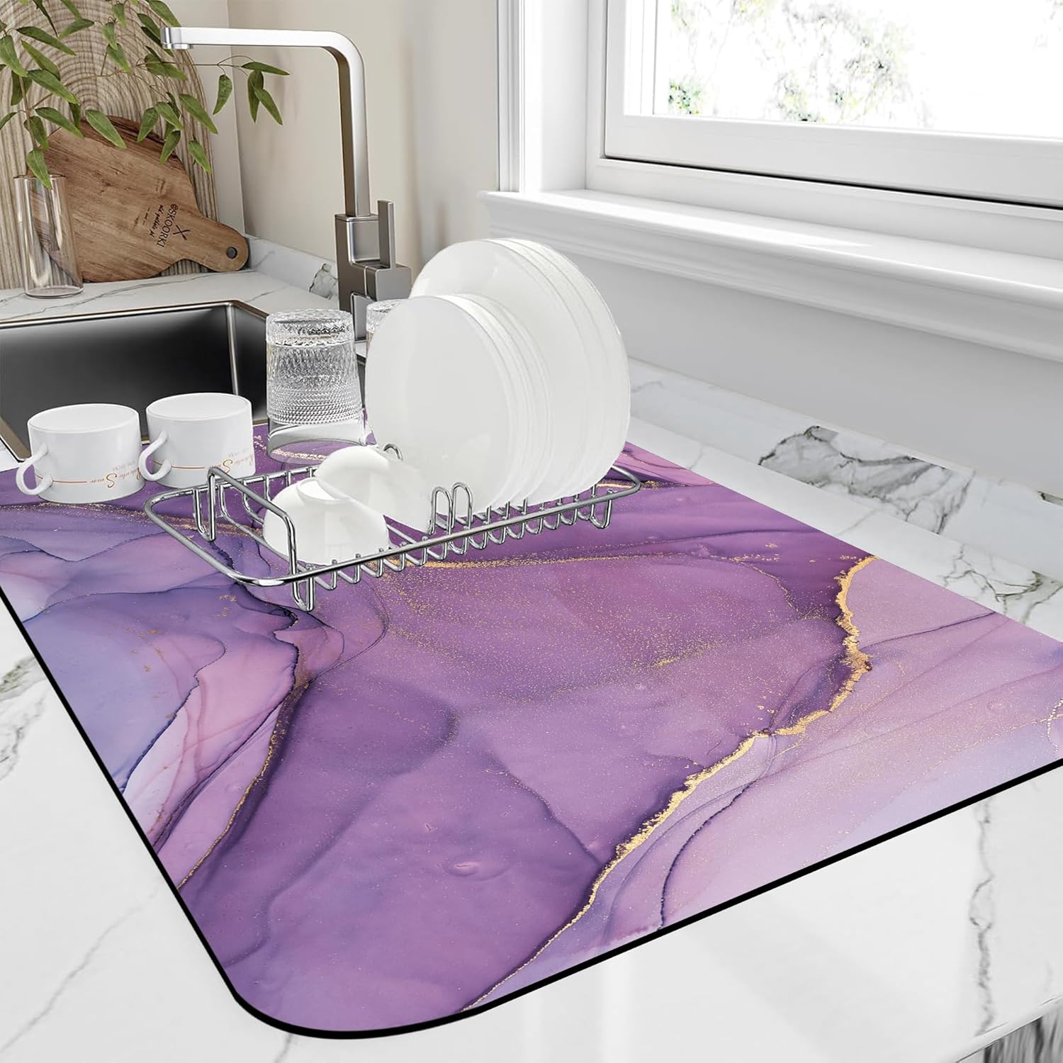 - 【Hide Stains & Easy to Clean】Our dish drying mat, the surface material porosity is up to 85%, which can quickly absorb stains. The dish drying mat can be washed by hand or machine to remove stains, it will not fade after repeated washing, and can be reused many times, due to the high-definition printed suede with excellent color locking effect, please do not use bleach to clean the mat.