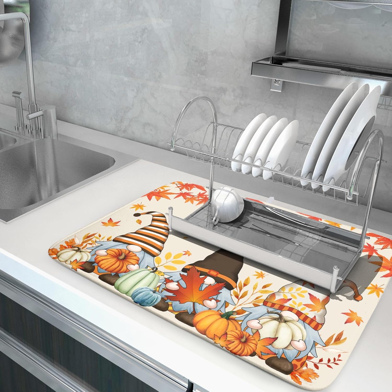 Fall Gnome Dish Drying Mat for Kitchen Counter Autumn Pumpkin Maple Leaves Dishes Pad Absorbent Fast Dry Dish Drainer Rack Mats 18x24 Inch Thanksgiving Day Drying Mats for Counter Accessories