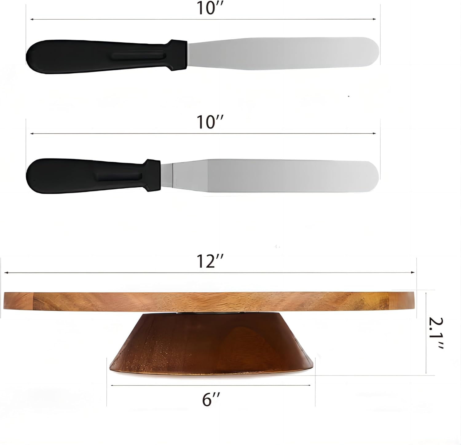 - Cake Decorating Supplies:1 Acacia wood cake turntable, 2 plastic icing spatulas and 3 plastic comb Icing Smoothers would allow you to invent all types of patterns on cakes, or cupcakes.(The comb has blue plastic film, please remove it before use)