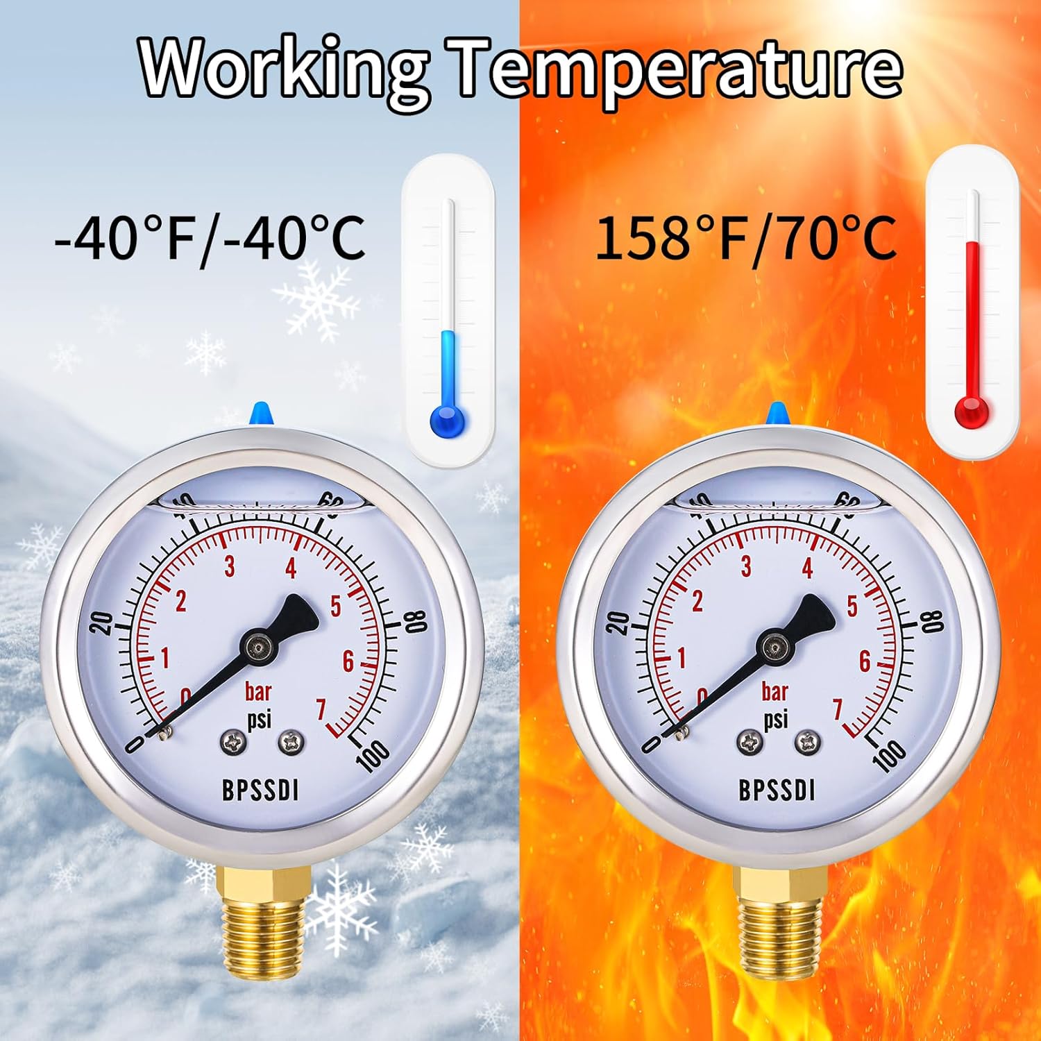 - Weather and Temperature Resistant - The pressure gauge can be used in environments from -40°C to 70°C in a variety of climates.