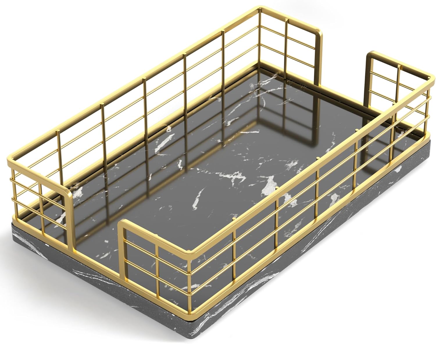 Wican Marble Guest Towel Holder Tray for Bathroom, Napkins Holder for Powder Room Dinning Table Wooden Basket for Disposable Paper Hand Towels Gold and Marble Black