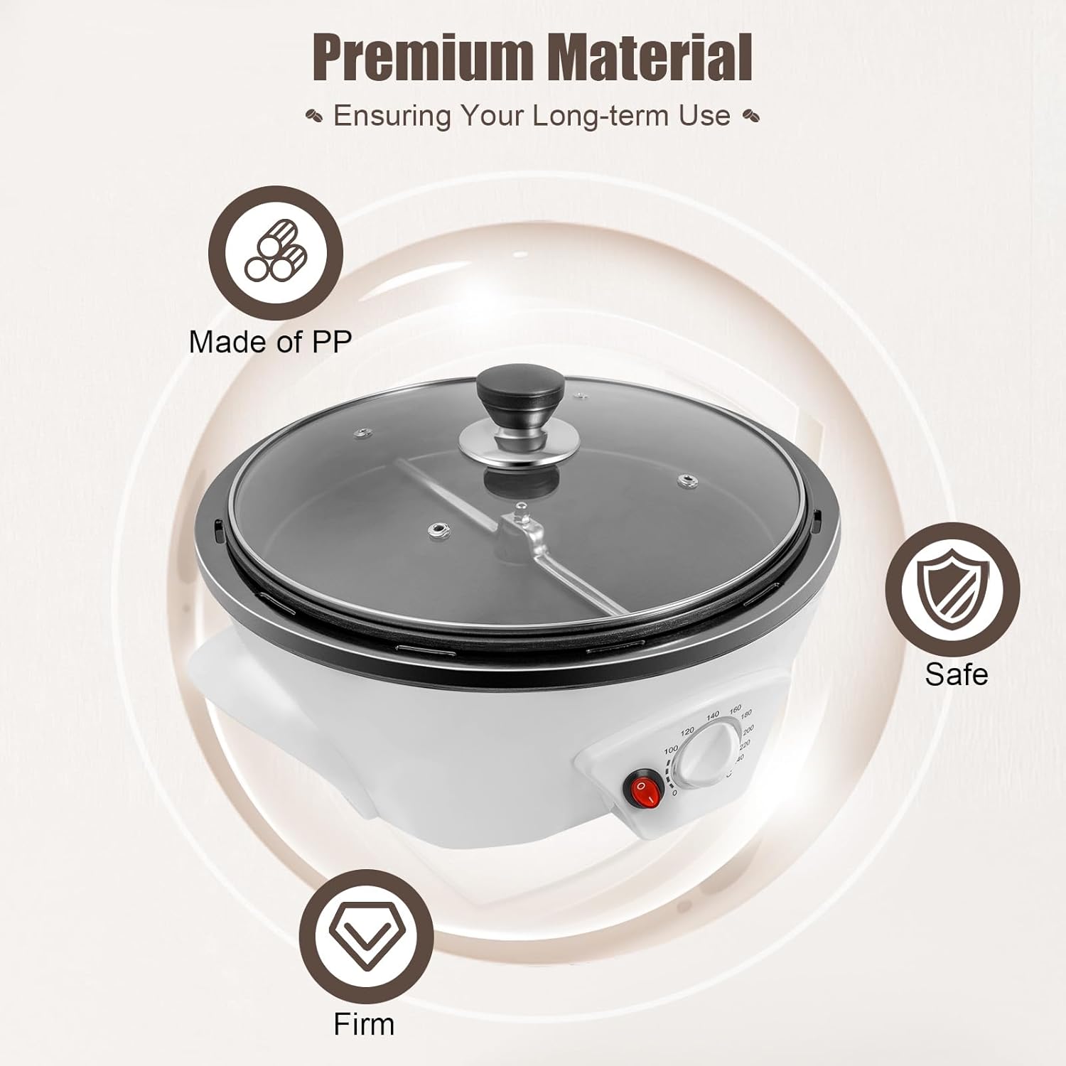 - High-quality Materials: The shell of the coffee bean roaster is made of PP material, which is wear-resistant and anti-deformation and has a long service life. At the same time, the transparent glass cover with 4 ventilation holes can be used to observe the roasting status of the beans at any time