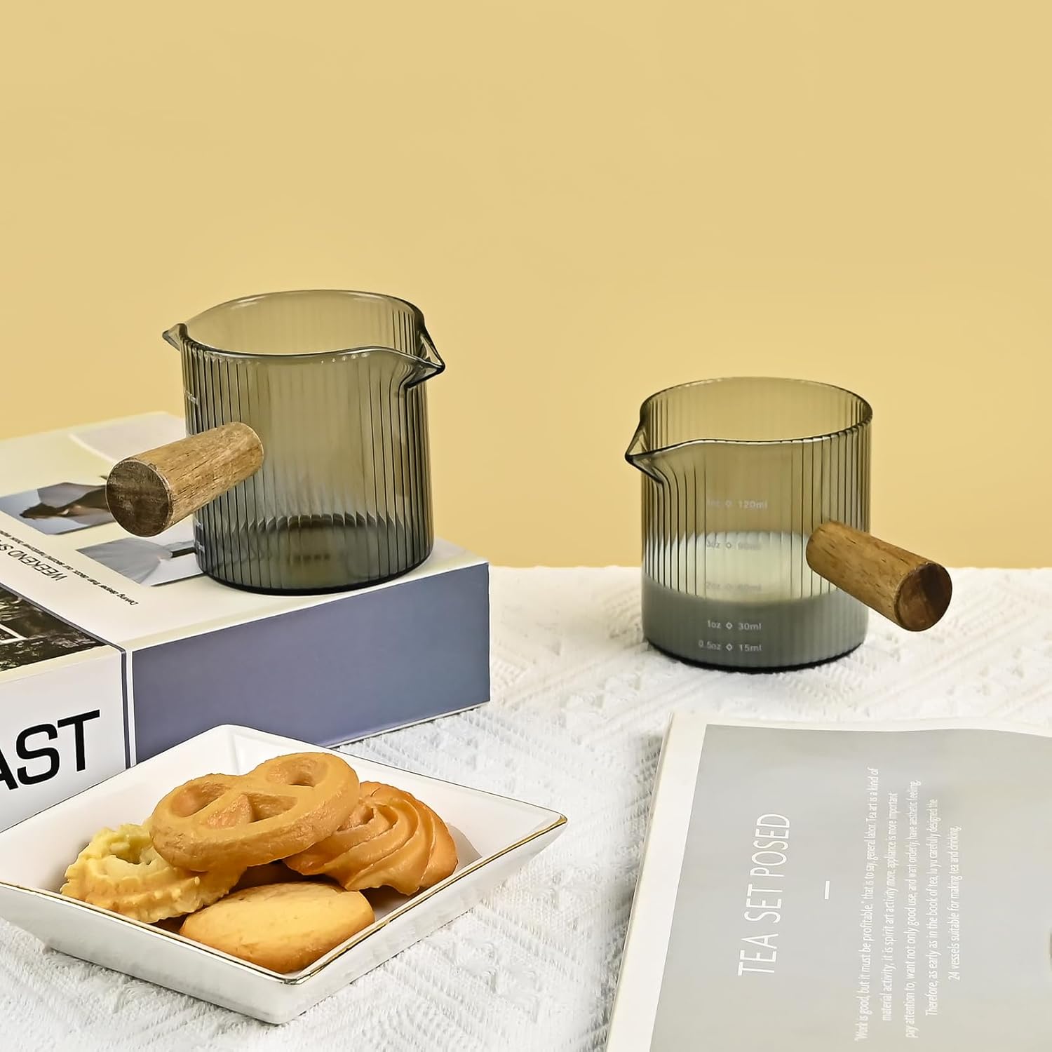 Glass Measuring Cup, 4oz Espresso Shot Glass with Wood Handle, Double Spouts Measuring Triple Pitcher Milk Cup for Coffee Tea (Gray Ribbed)