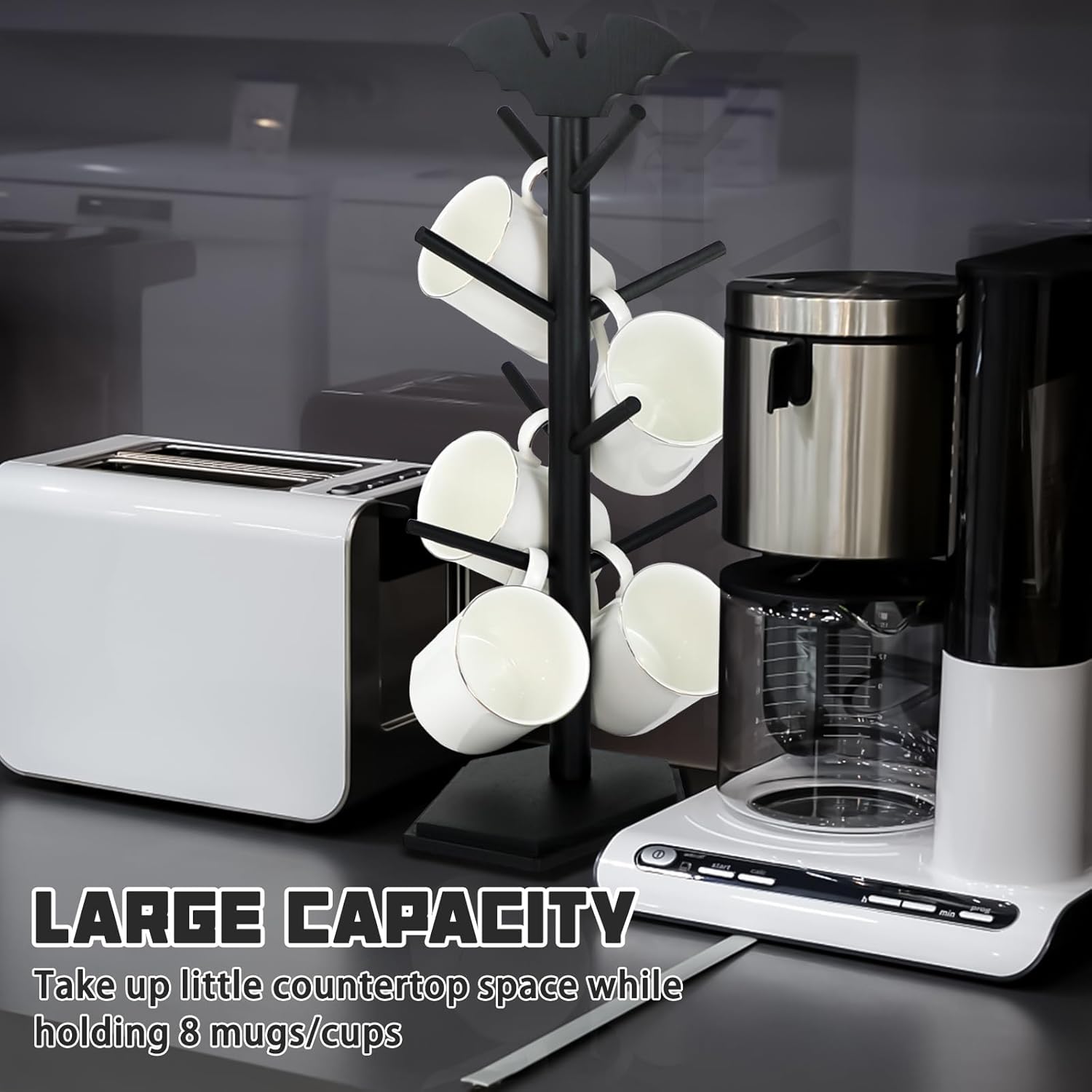 Bat Mug Holder Tree - 8 Hooks Coffee Mug Rack - Gothic Home Decor Wood Coffee Mug Tree for Countertop - Coffee Cup Holder for Halloween Kitchen Organizer & Coffee Bar Accessories, Black