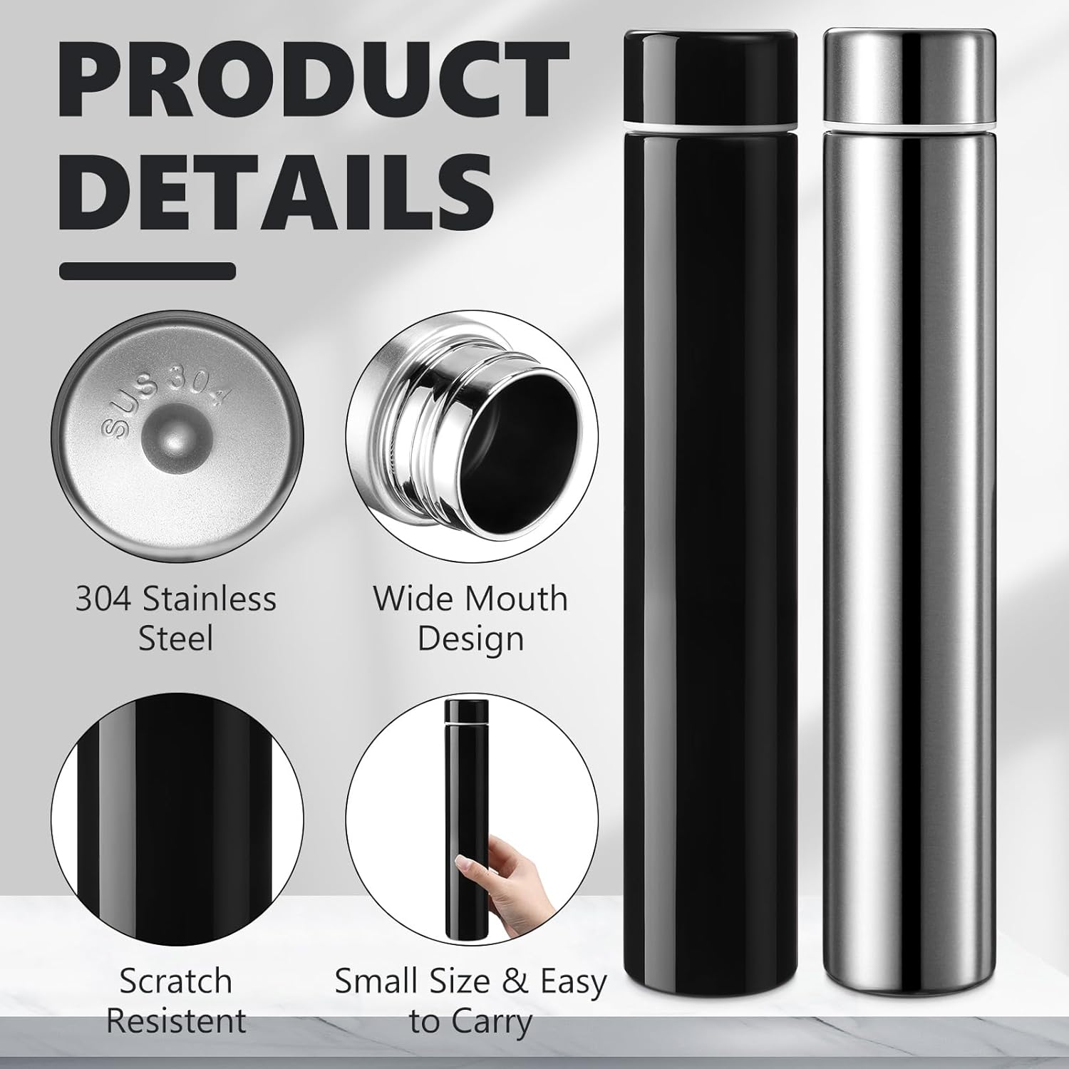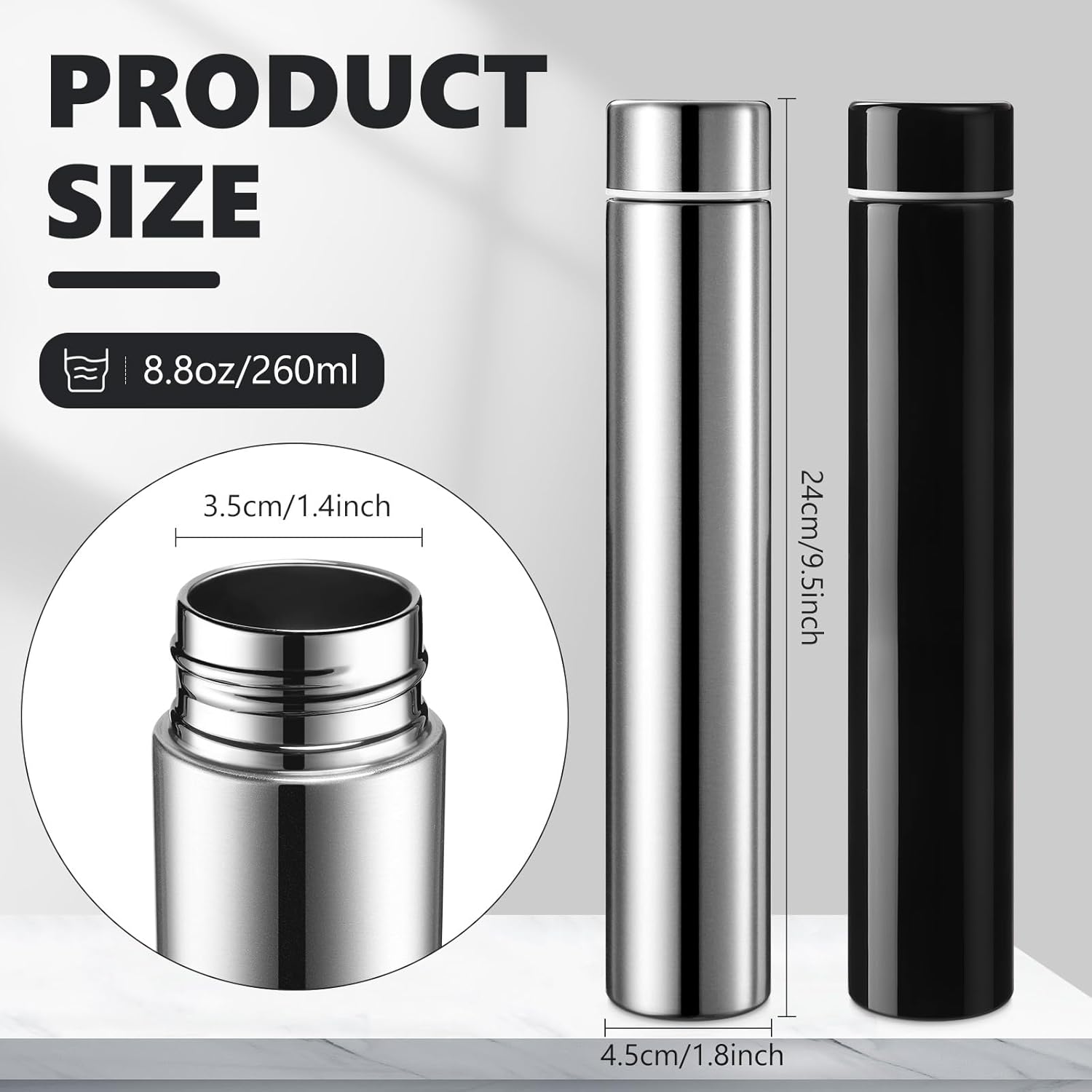 Vesici Slim Water Bottle 8.8 oz Small Stainless Steel Purse Compact Insulated Water Bottles Camping Travel Backpack Pocket Flask for Car Cold Coffee Tea(Silver, Black,2 Pack)