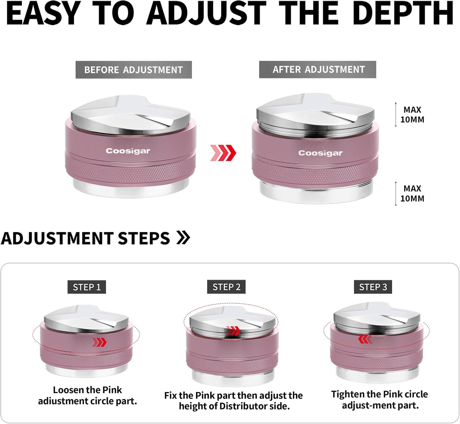 - ใ๐ ๐จ๐จ๐-๐๐ซ๐๐๐ ๐๐ญ๐๐ข๐ง๐ฅ๐๐ฌ๐ฌ ๐๐ญ๐๐๐ฅใCoosigar coffee distributor/tamper base is made of 100% food-grade stainless steel, ensuring safety,health, and easy cleaning. We adhere to the design philosophy of quality, functionality, and user experience, with the handle crafted from stylish and durable high quality aluminum alloy. It conforms to ergonomics, providing you with a stable and comfortable gripping experience and an excellent tactile sensation.