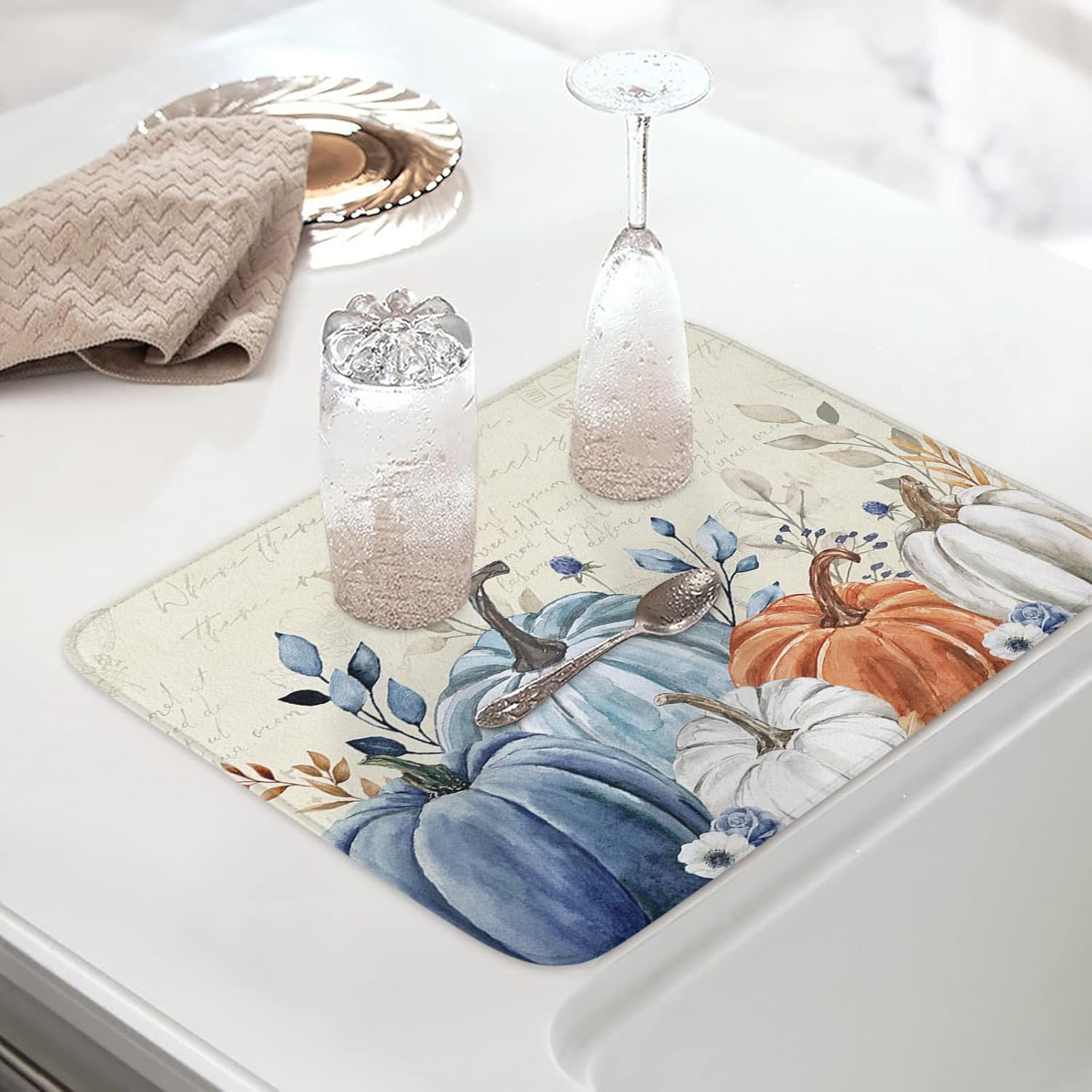 - Fall & Thanksgiving Decor - Blue pumpkin drying mats can add an chic holiday vibe and charm to your kitchen or coffee bar counter. The drying mat for kitchen counter with a unique hanging rope design that can be hung without occupying any space.
