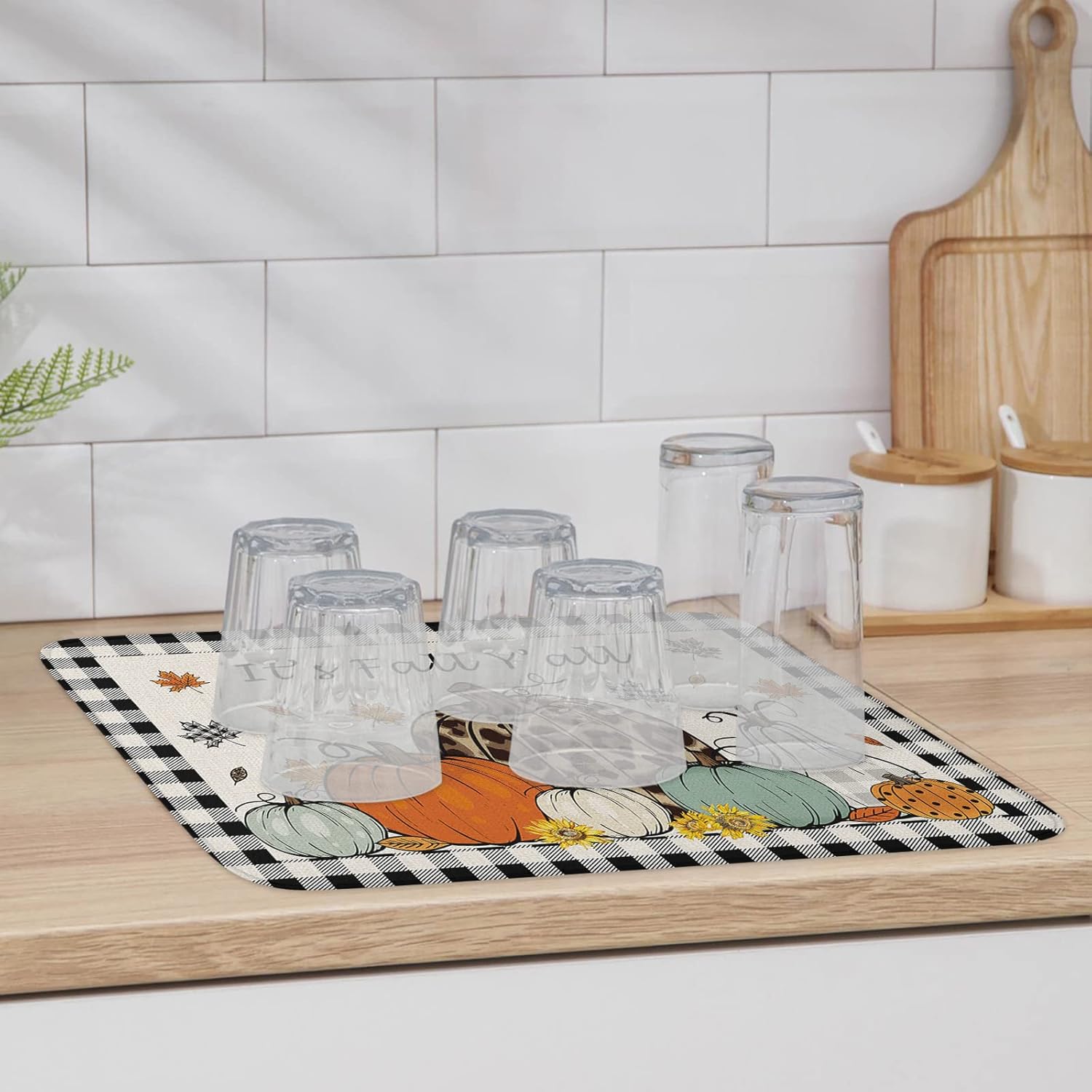 Fall Dish Drying Mat for Kitchen Counter Pumpkin Drying Pad Absorbent Drying Mats for Countertops Sinks Draining Racks Maple Leaves Black Buffalo Plaid Drainer Holiday Harvest Thanksgiving Decor 16x18