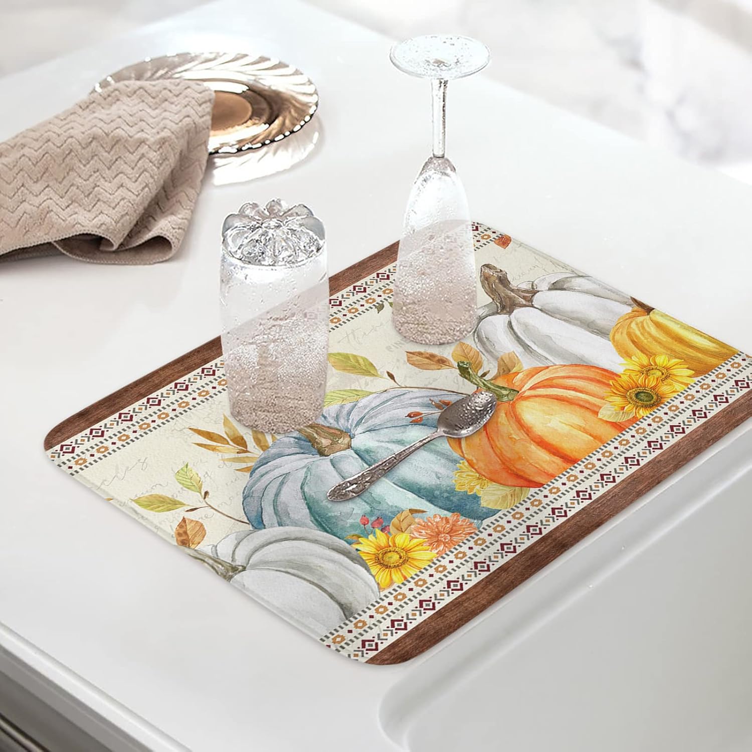Fall Dish Drying Mat for Kitchen Counter Pumpkin Drying Pad Absorbent Drying Mats for Countertops Sinks Draining Racks Sunflower Eucalyptus Leaves Drainer Holiday Harvest Thanksgiving Decor 16x18