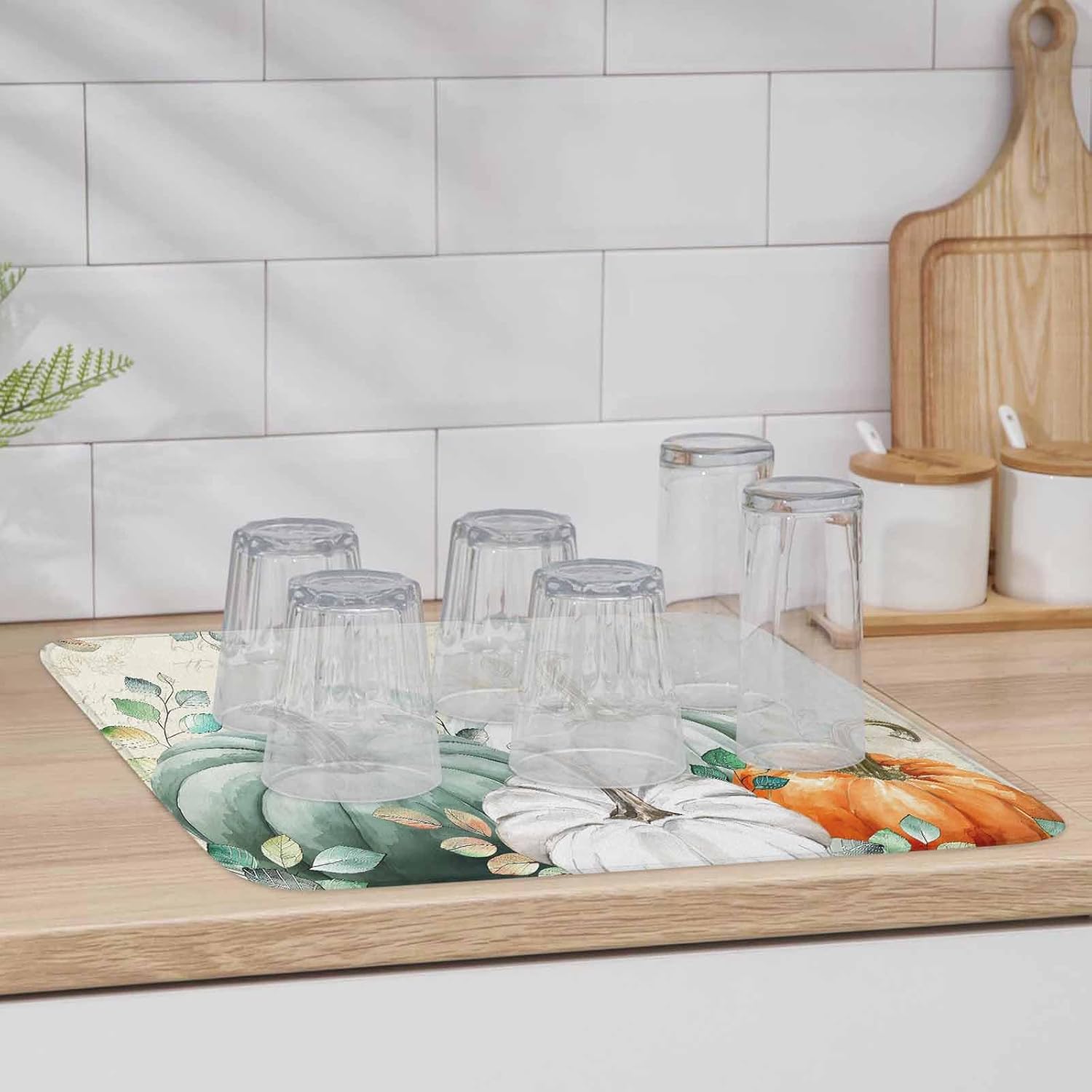 Fall Dish Drying Mat for Kitchen Counter Green Pumpkin Drying Pad Absorbent Drying Mats for Countertops Sinks Draining Racks Eucalyptus Leaves Drainer Holiday Harvest Thanksgiving Decorations 18x24
