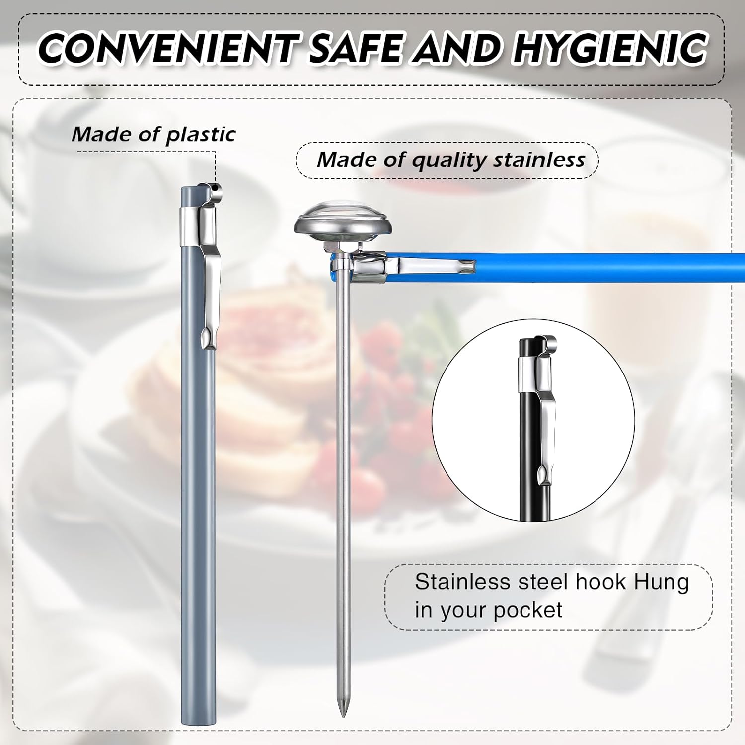 - Long Lasting and Quality: our cooking thermometer is made of stainless steel material with a plastic sleeve, reliable and long lasting, heat resistant and sturdy, not easy to break or rust, safe and quality, lightweight and portable, you can use it for a long time