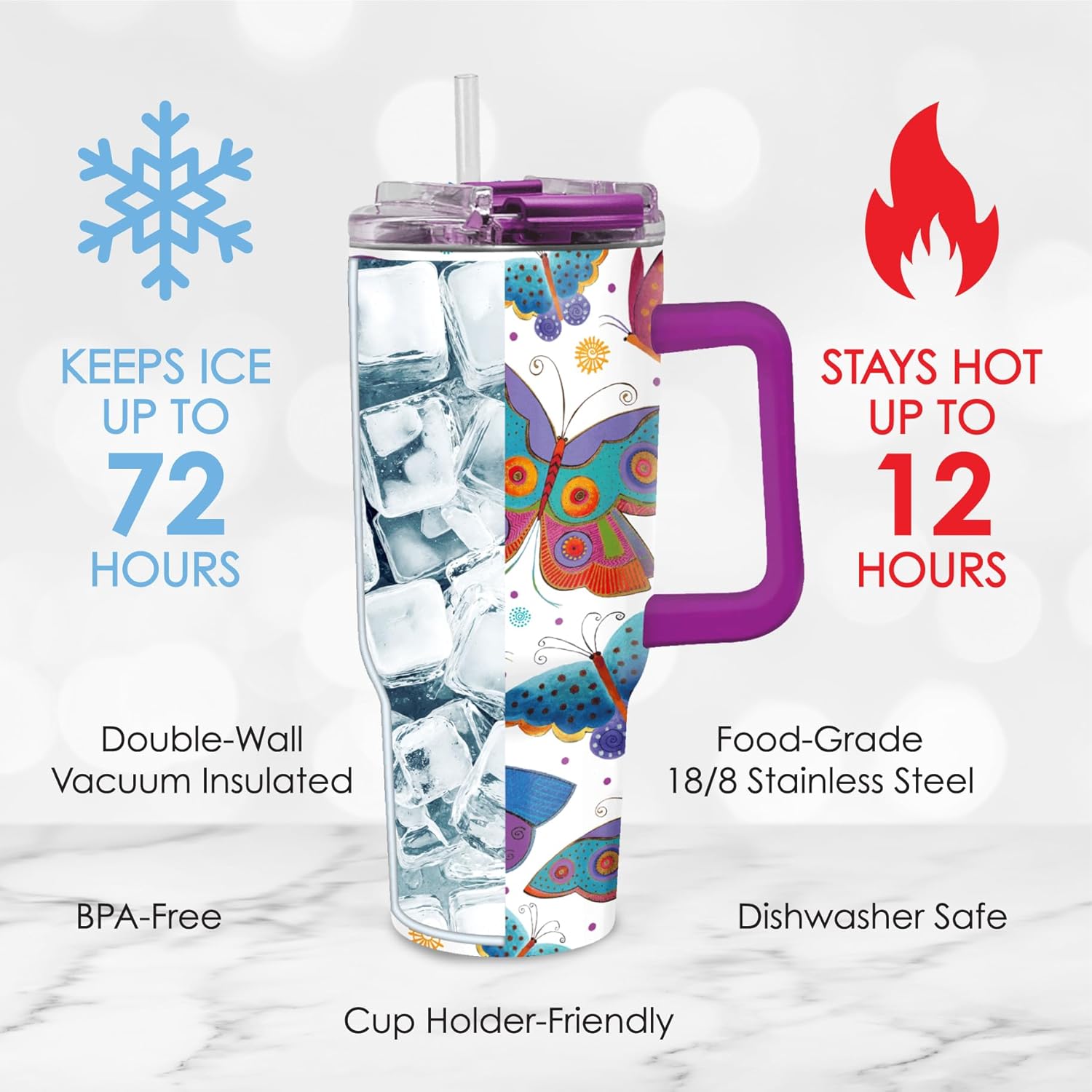 - STYLISH AND VERSATILE: The sleek, modern design of this water Tumbler makes it a fashionable accessory for any occasion. Whether you're hitting the gym, the office, school, or the trails, it's the perfect choice. Stunning rendering of Laurel Burch's famous oil painting, "Mariposas." The design is captured with an artist’s eye for detail, light, and color.