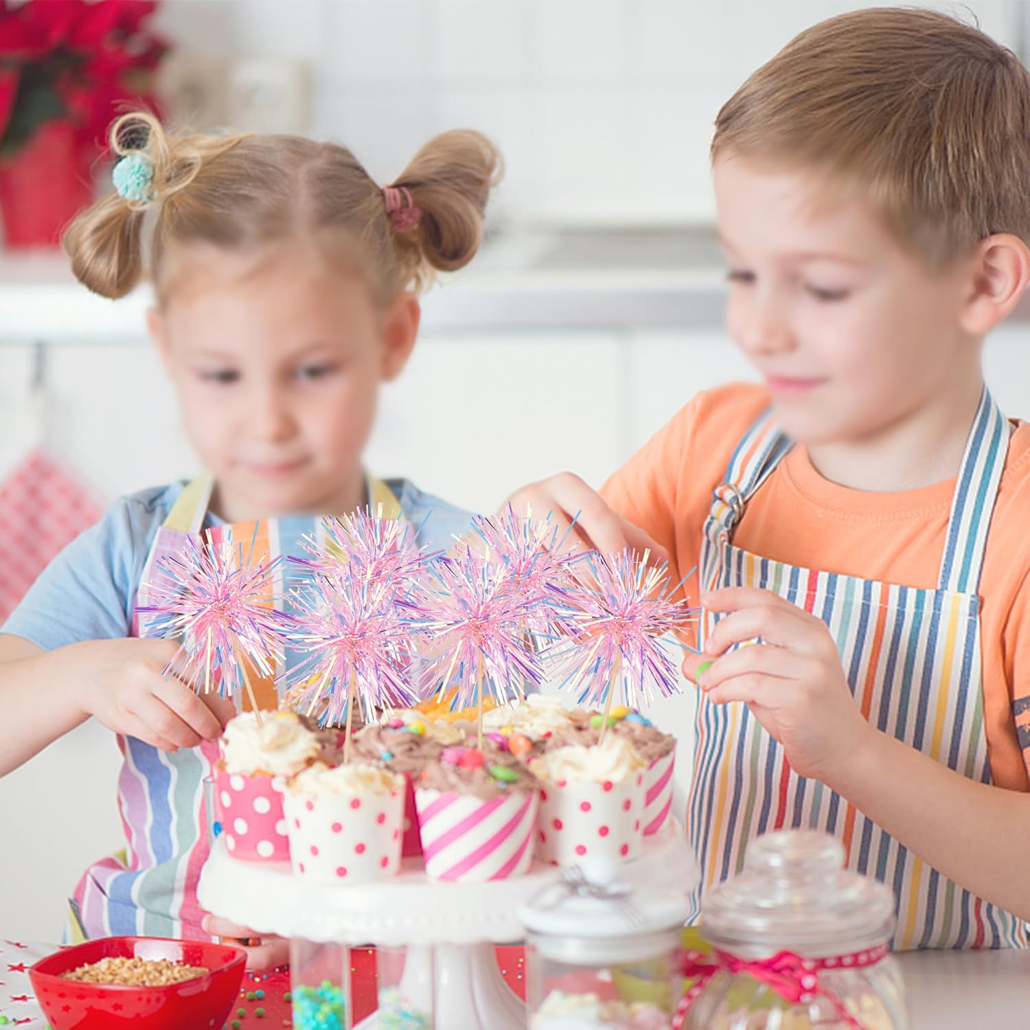 30 PCS Foil Firework Cupcake Toppers Happy Birthday Cupcake Toppers Sparkle Tinsel Flower Drink Stirrers Cocktail Fruit Toothpicks for Valentine's Day Baby Shower Party Cake Decor Supplies Pink