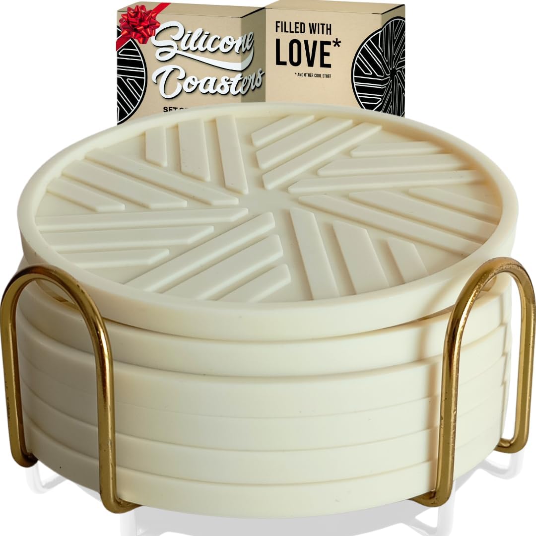 - Elegant Design and Organized Storage: Includes 6 ivory silicone coasters with a modern geometric pattern and a gold metal holder, perfect for stylish home decor.