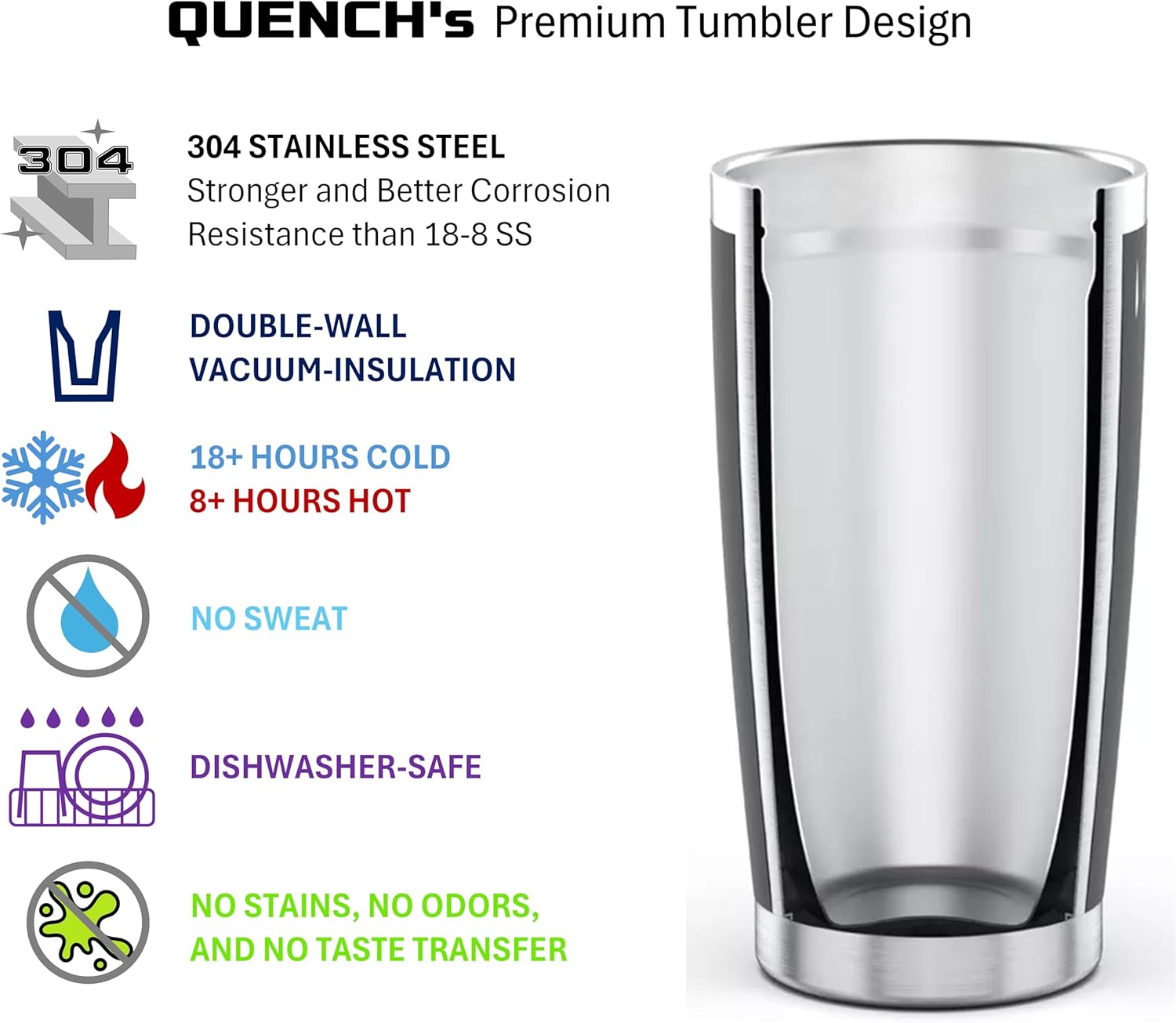 - EXCEPTIONAL QUALITY: Our tumbler uses 304 stainless steel which has better strength and corrosion resistance than other tumblers made of 18-8 stainless steel. All materials are BPA-free and FDA-compliant. We are proud to use only the highest quality materials in our products.