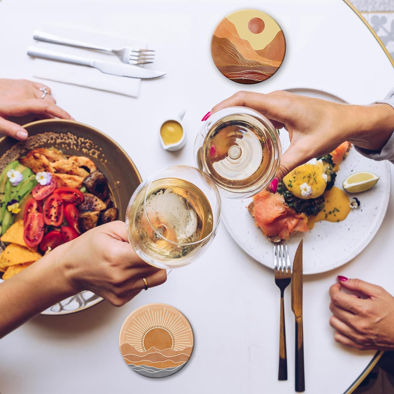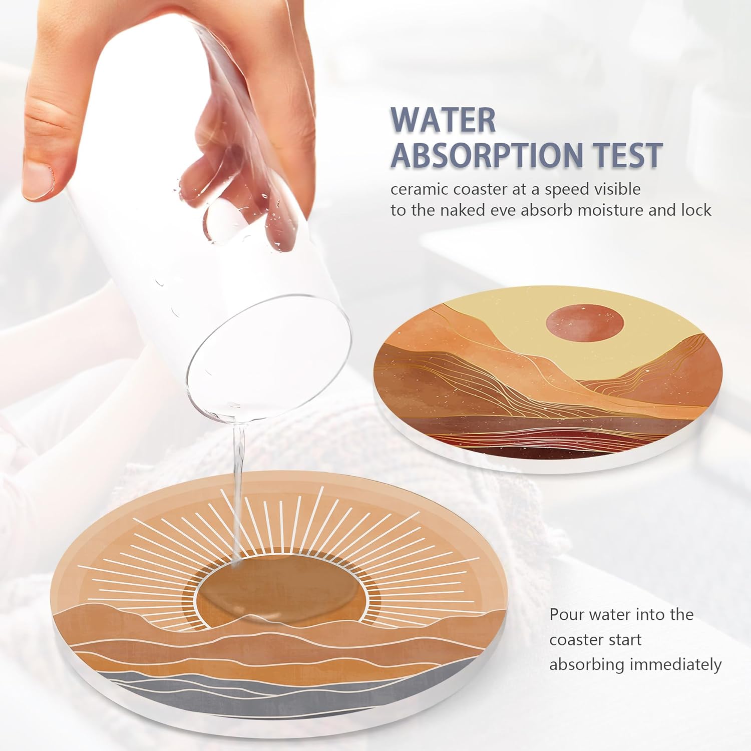 6 Pcs Coasters for Drinks with Holder, Boho Mountain Sun Absorbent Ceramic Coasters with Cork Base,Cute Funny Table Drinks Coasters Tabletop Protection Mat,Table Home Decor,4 Inches