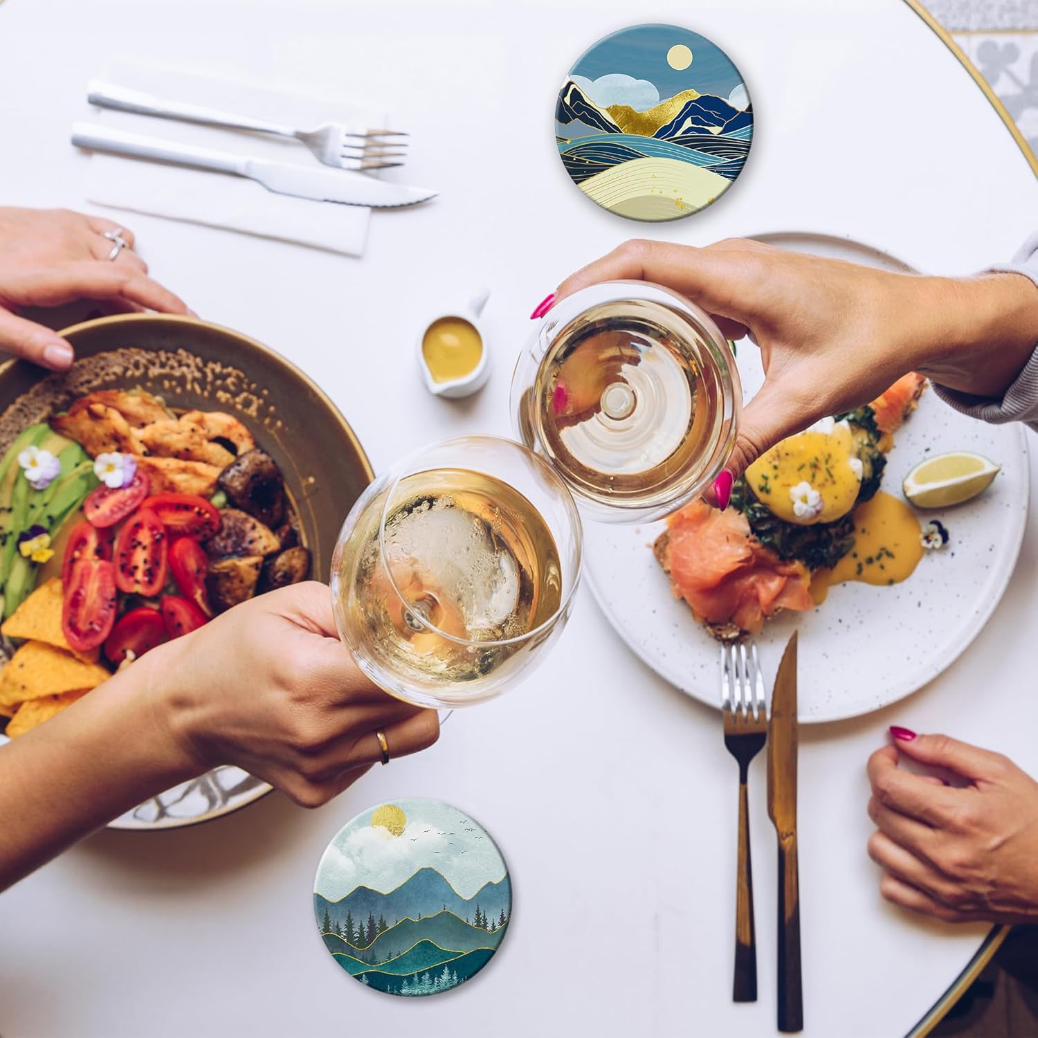 - Husiti Ceramic Coasters Set With Metal Holder: Keep Your Dining Table Stylish And Organized With This Set Of 6 4-Inch Round Coasters Featuring a Trendy Abstract Mountain Sun Pattern.