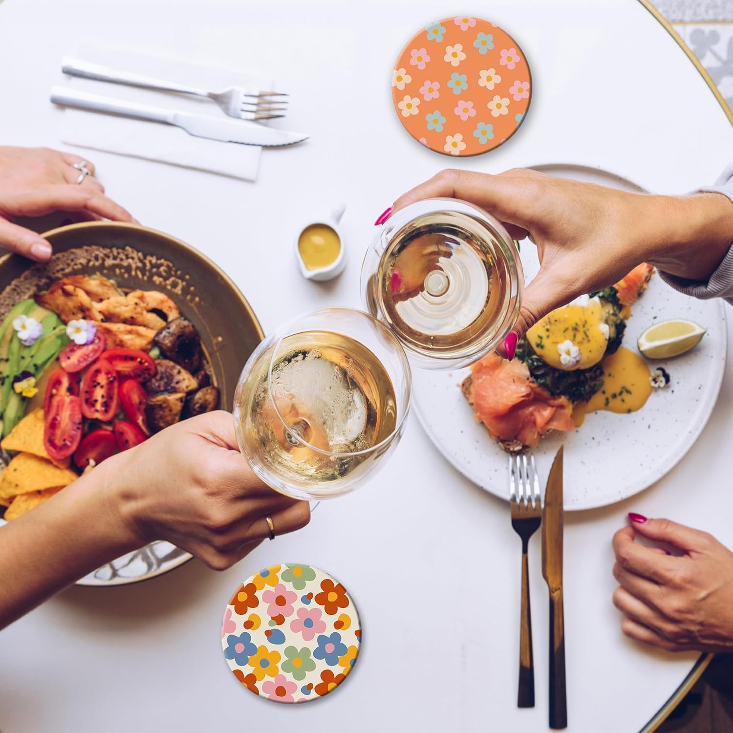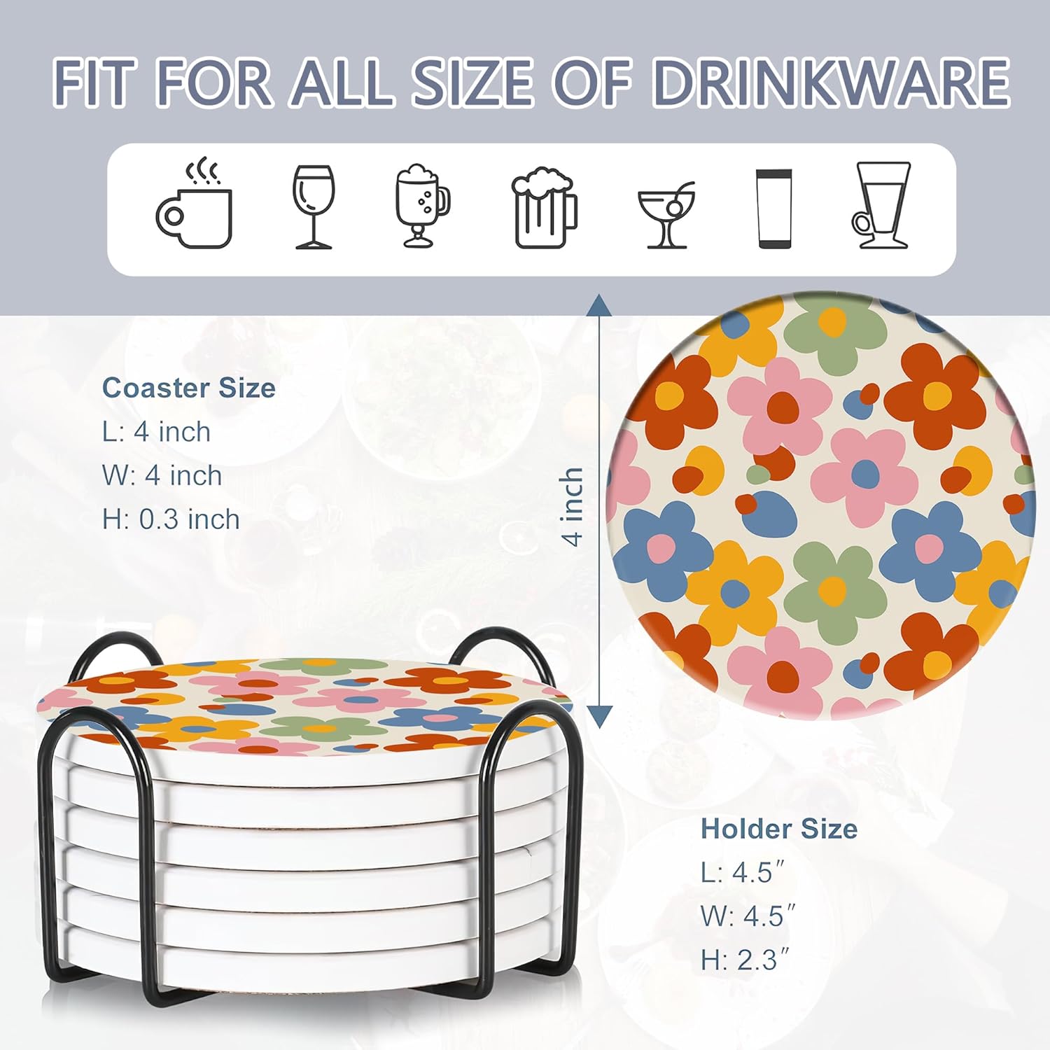 - Husiti Ceramic Coasters Set With Metal Holder: Keep Your Dining Table Stylish And Organized With This Set Of 6 4-Inch Round Coasters Featuring a Trendy Vintage Groovy Flowers Pattern.