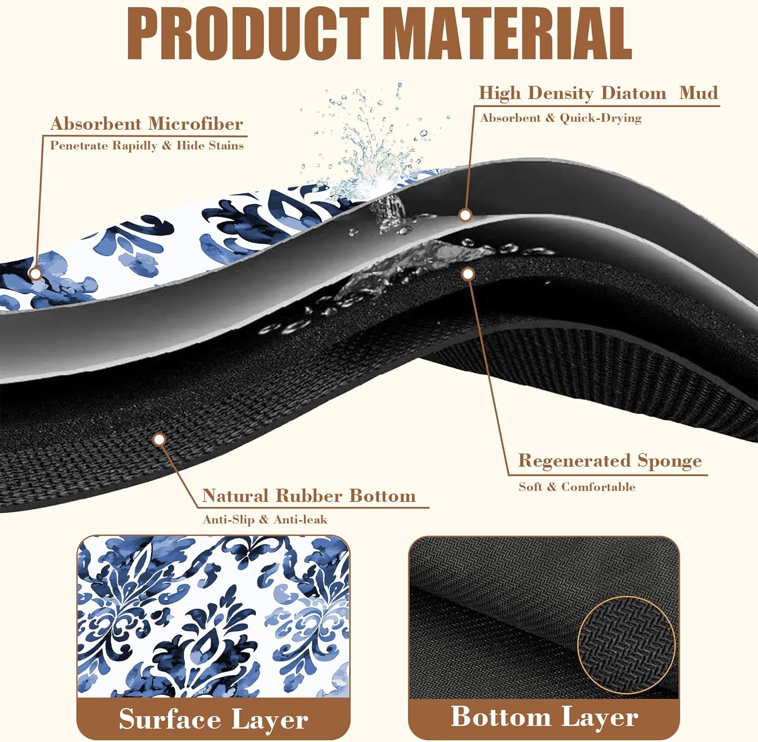 Blue Damask Flower Dish Drying Mat for Kitchen Counter Coffee Bar Mat Hide Stain Absorbent Rubber Backed Drying Rack Pad Espresso Machine Coffee Bar Accessories 15.7 x 23.6 Inch
