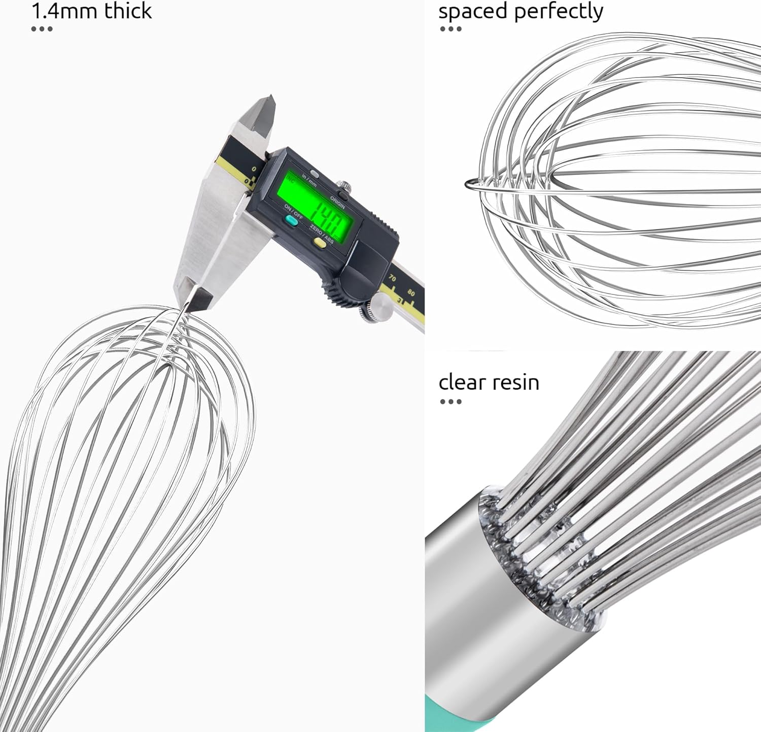 - [12 High Flex Wires for Efficient Whisking] With 2 more wires than other kitchen whisk and the high elastic 18/10 stainless steel material, this 12-wires cooking whisk has the right amount of flex to create that "whip" effect by adding more air to the mix. All 1.4mm thick wires are spaced perfectly for whipping and mixing and release anything holding on easily with just a quick rinse and scrub. You will be surprised at how quickly the egg whites come to firm peaks with this metal whisk.