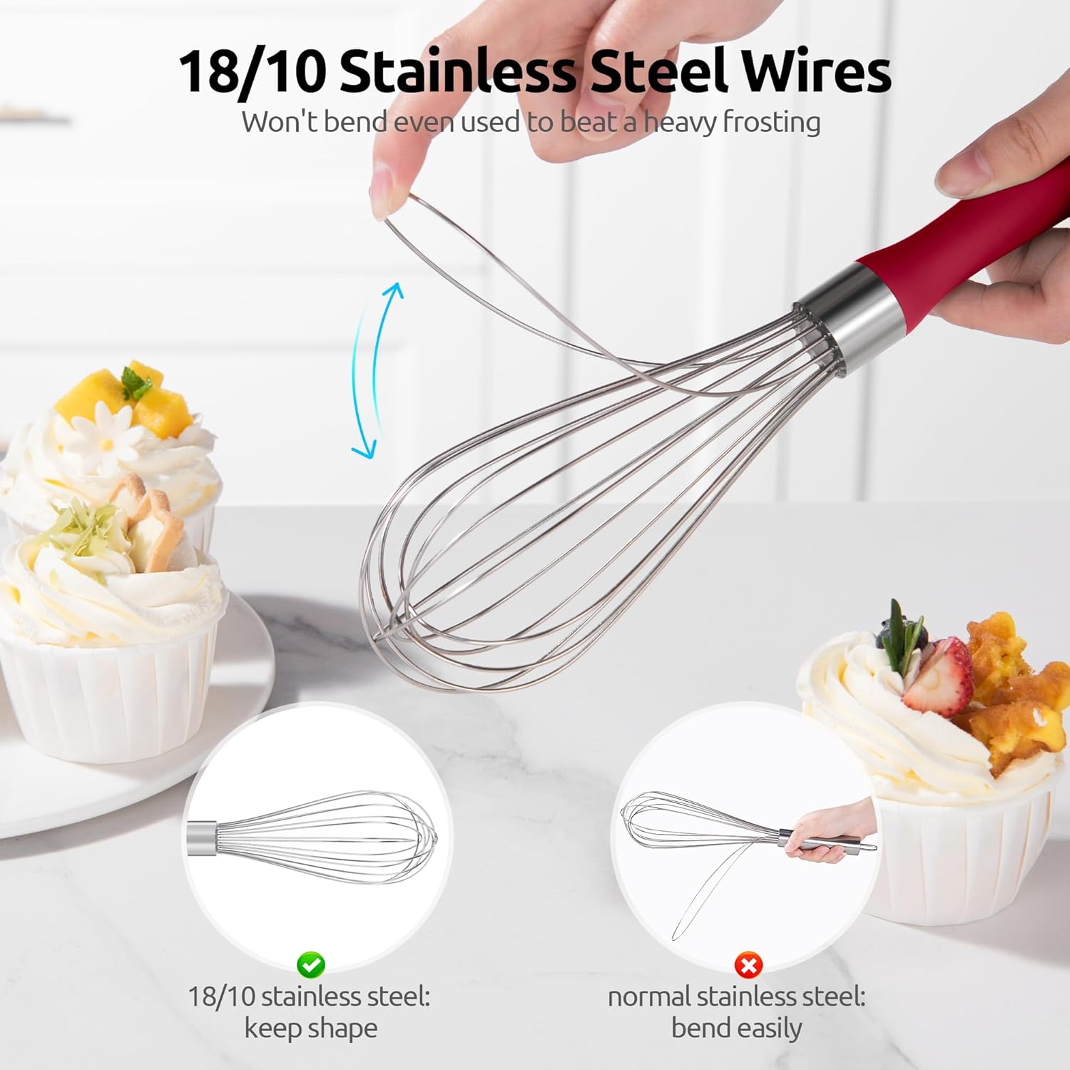 - [8 High Flex Wires for Efficient Whisking] With 8 flexible wires and the high elastic 18/10 stainless steel material, this 8-wires cooking whisk has the right amount of flex to create that "whip" effect by adding more air to the mix. Wires are spaced perfectly for whipping and mixing and release anything holding on easily with just a quick rinse and scrub. It can whip up anything quickly and efficiently. 1.4mm thick wire has a right balance between strength and whisking efficiency.