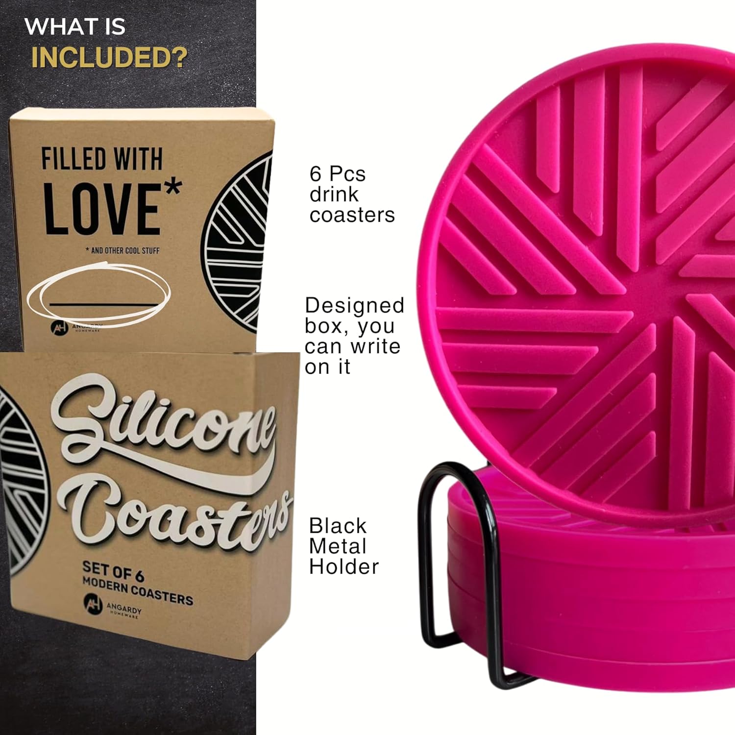 Silicone Coasters with Holder - 6 Pack - Absorbent Table Coasters for Drinks - Home Decor Coffee Table - with Stylish Groove Pattern -Housewarming Gifts Cute Pink