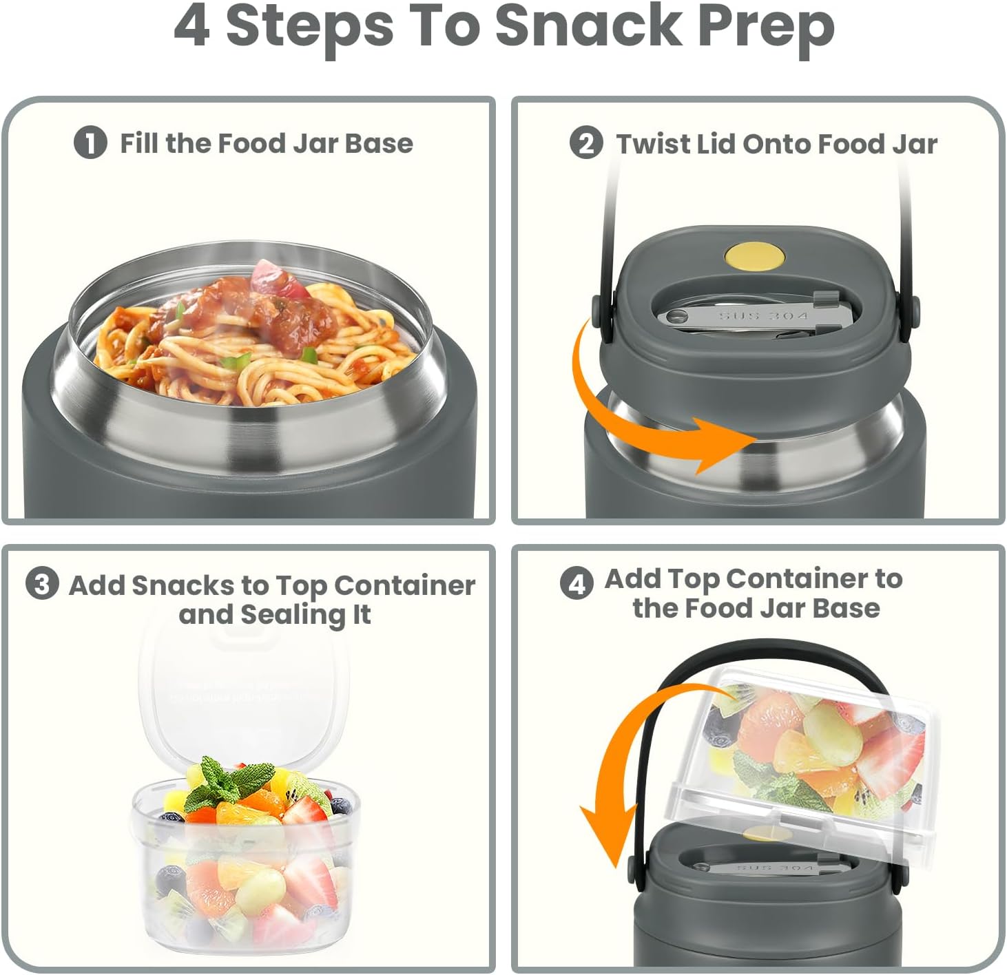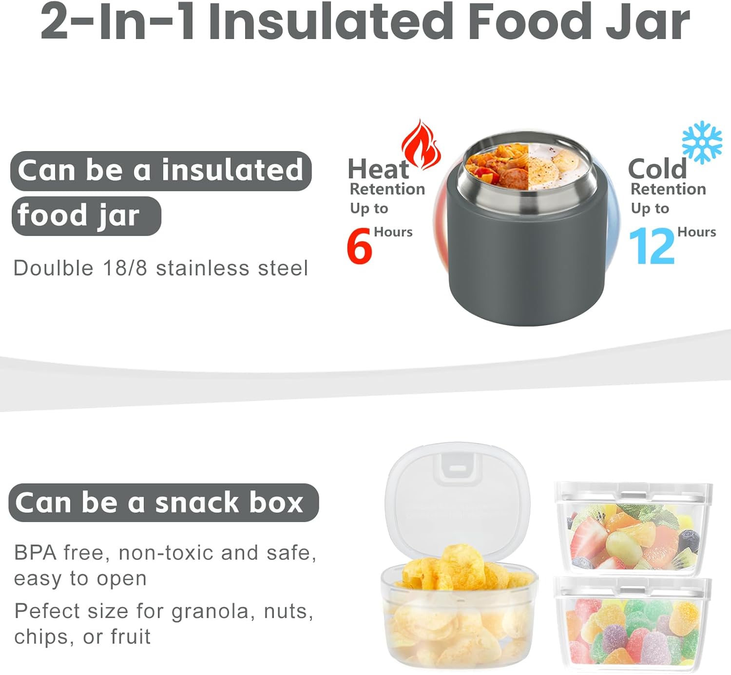 - 2-in-1 Separation Design: Crafted from durable 18/8 stainless steel with a vacuum-sealed design, the insulated food jar keeps your meals hot for up to 5 hours and cold for over 10 hours. The top transparent container doubles as a snack box, perfect for storing granola, nuts, chips, or fruit—offering versatility and easy access to your favorite snacks.