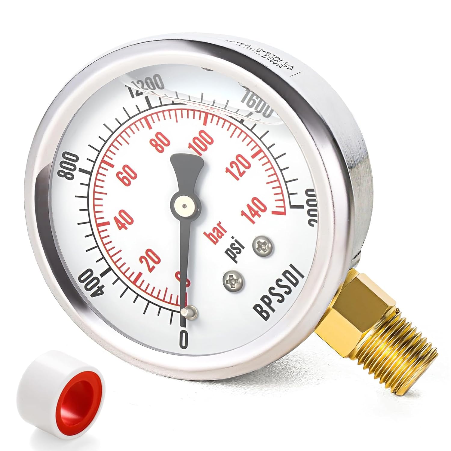 0-2000 Psi Glycerin Liquid Filled Hydraulic High Pressure Gauge, 2.5" Dial Size, 1/4" NPT Lower Mount, 304 Stainless Steel Case, for Water Oil Air Gas Pressure Test