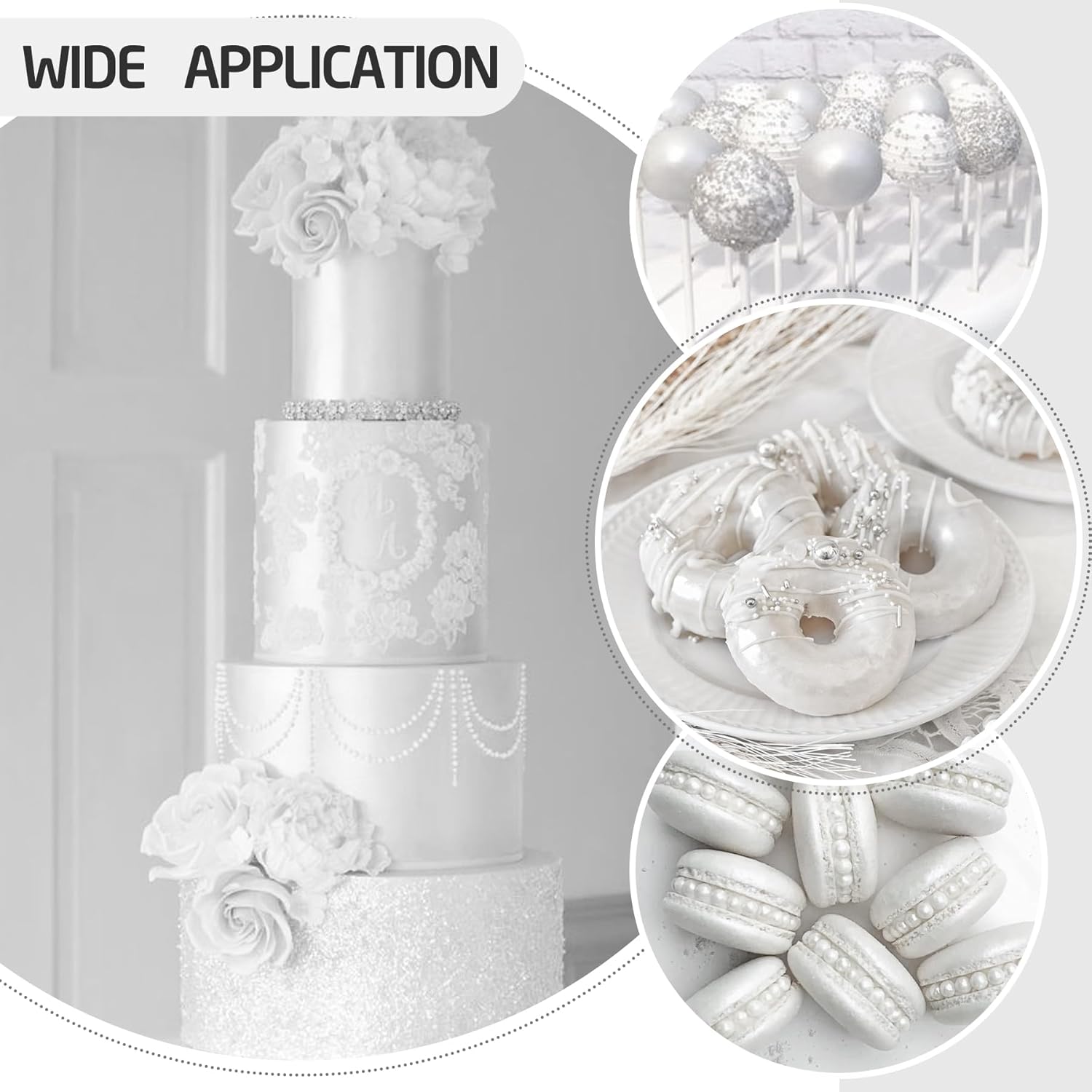 - WIDE APPLICATION - The shimmer luster dusts food coloring powder is ideal for decorating fondant, chewing gum paste, cake, icing, cookie, metallic finish, chocolate and other gourmet baked goods. You can also create shimmery cocktails, champagne or any luxury beverage.