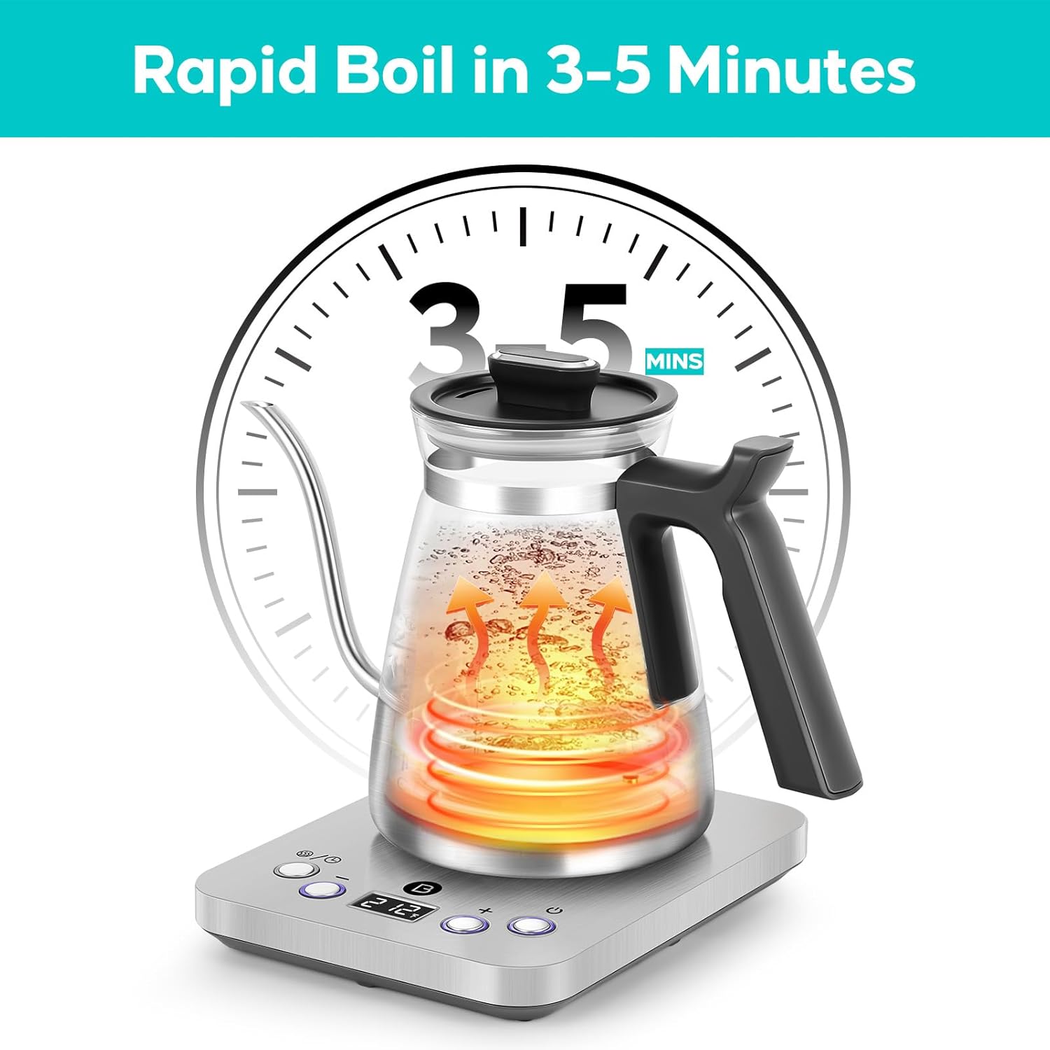 - RAPID BOILING IN MINUTES: Featuring a powerful 1200W heating element, this gooseneck electric kettle boils 0.8L of water in just 3-5 minutes. Whether you're making coffee, tea, hot chocolate, soups, instant oatmeal, ramen noodles, or preparing powdered milk, this electric tea kettle ensures quick and efficient service, saving you valuable time