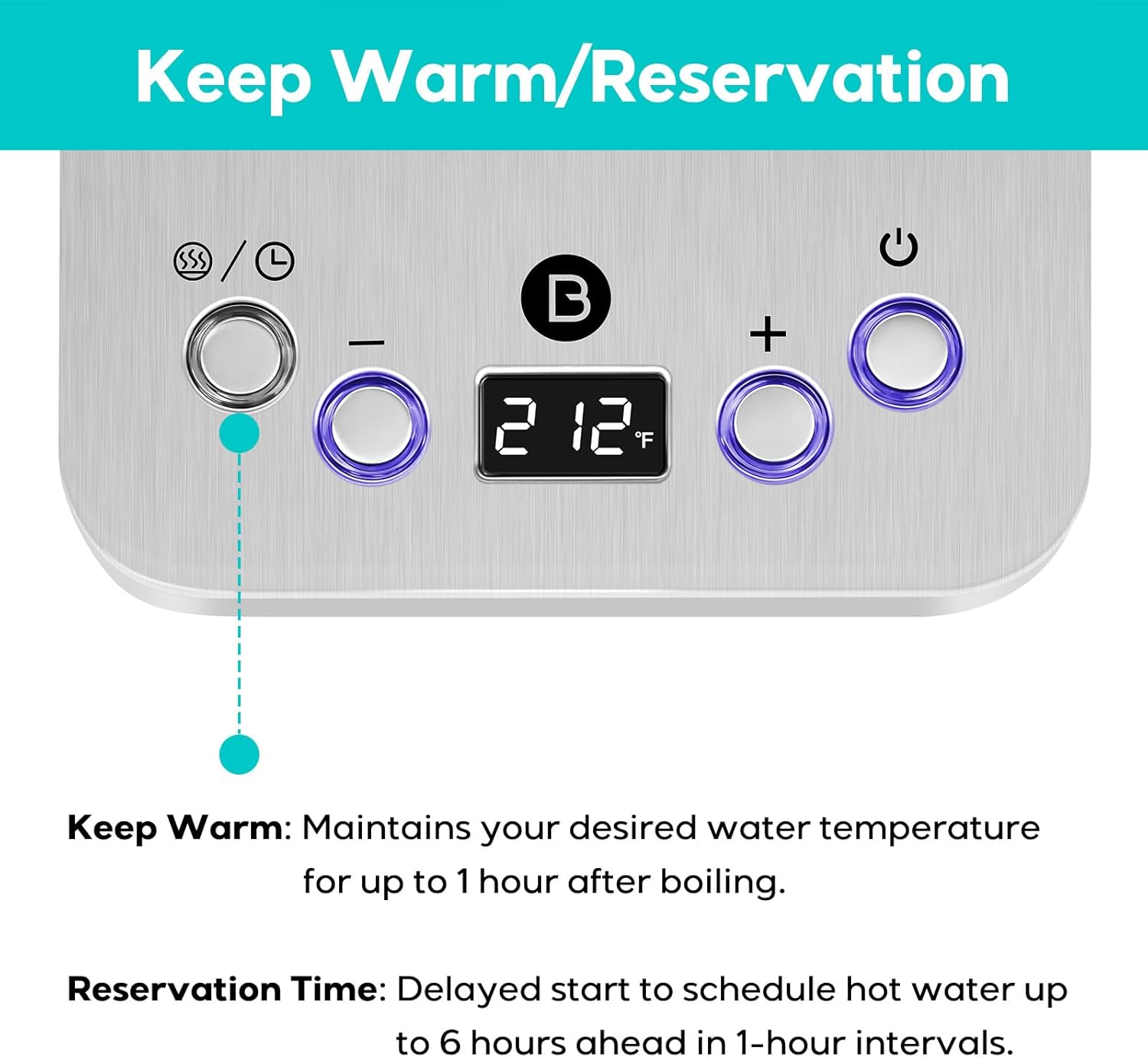 - RESERVATION TIME & 1H KEEP WARM: This hot water kettle electric features an innovative reservation function, allowing you to preset boiling times up to 6 hours in advance. Choose from 1, 2, 3, 4, 5, or 6-hour delays to suit your needs. The tea kettle electric includes a keep-warm function that maintains your desired water temperature for up to one hour