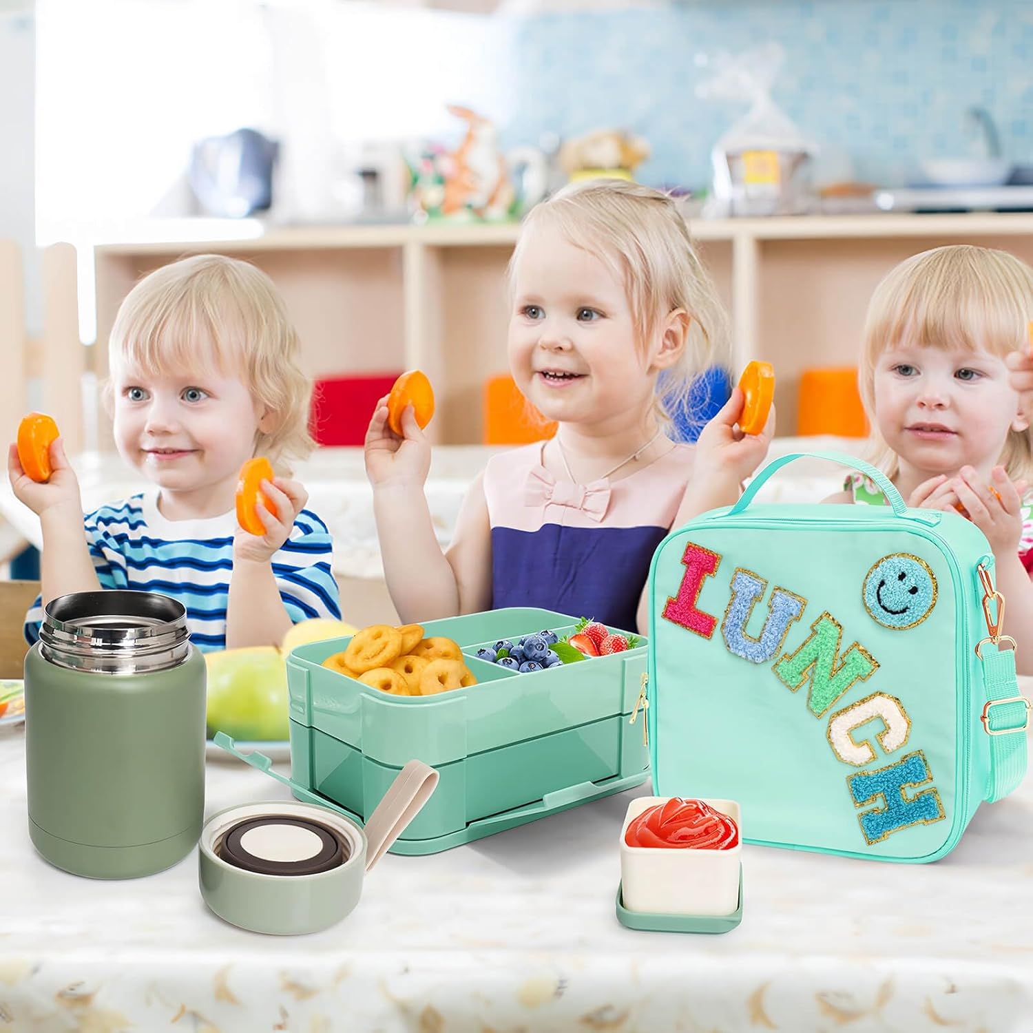 - Our green 3 piece lunch bag set includes a preppy lunch box, a food thermos and a double-layered bento lunch box with cutlery and sauce cups. (Age rating: 4 years and up.) Note: Thermos only be hand washed, not in the dishwasher!