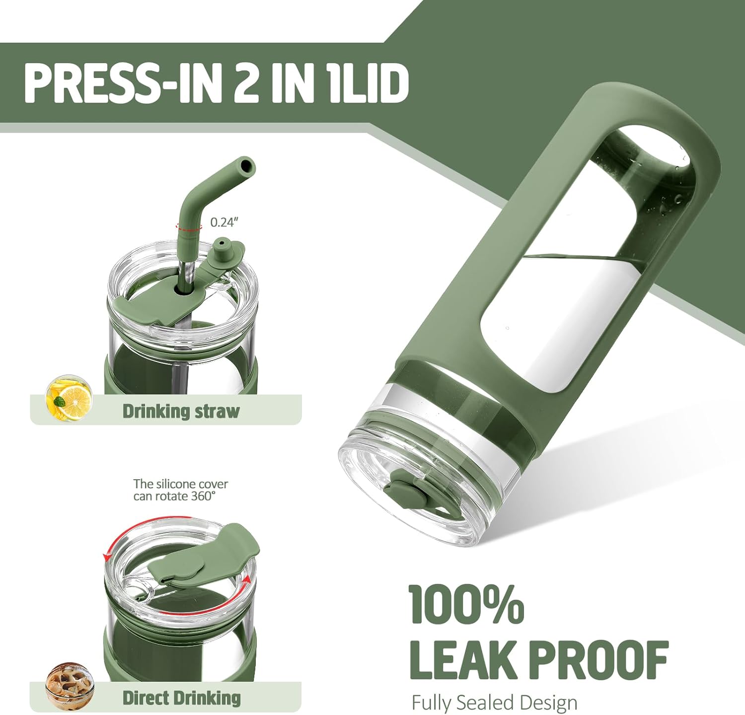 Kodrine 24oz Glass Tumbler with 2 Lids and Straws, Glass Cup With Bamboo Lid and On-the-go Lid, Reusable Iced Coffee Cup, Ideal for Smoothie, Cold Drinks, Fit Cup Holder, BPA Free (1, Olive)