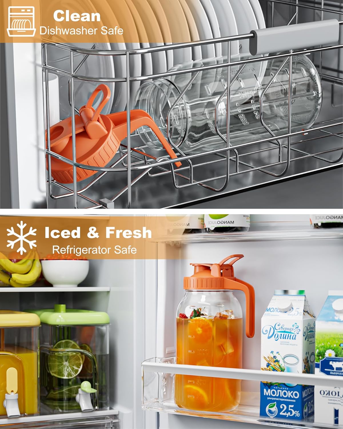 - Premium Quality Glass Jug: This glass water pitcher is crafted from high-quality, food-grade glass that is durable and resistant to breaking. Both the glass jar and lid are free of lead, cadmium, and BPA, and are odorless, ensuring that your drink's taste is not affected. The pitcher is refrigerator-safe and dishwasher-friendly