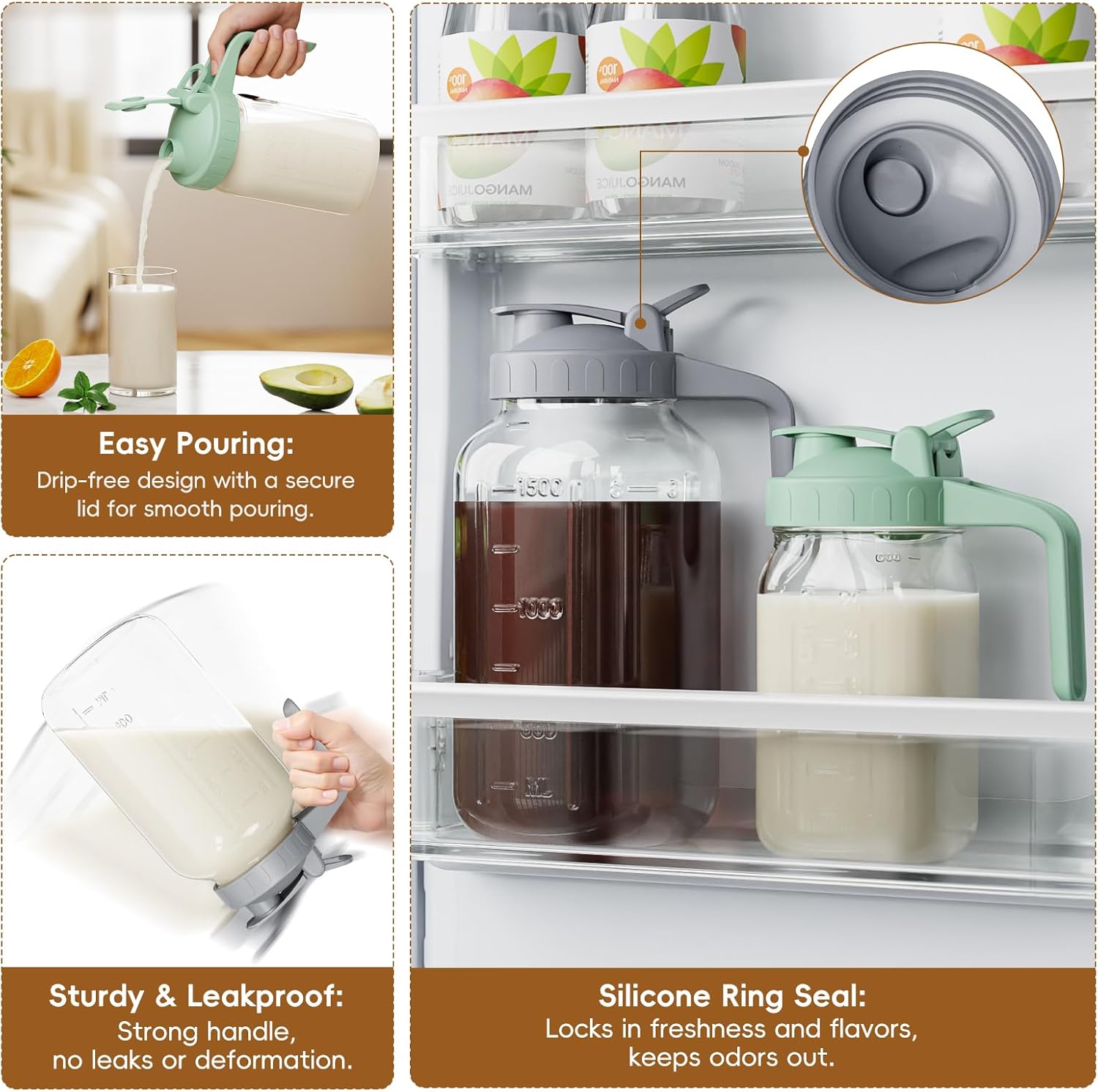 - 【Spout Sealed Lid with Handle】 - The 64oz big jug with silicone seal in the pour spout lid, Leak proof and better maintain the freshness and taste of the beverage, avoid mixing the smell of other foods in the fridge. The flip-top lid is easy to pour and the jug is securely fastened to the lid
