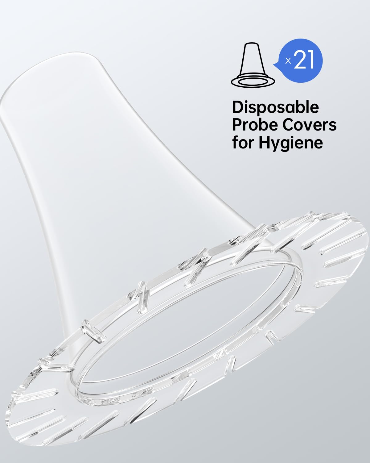 - Non-Contact More Hygienic - No contact with the probe during temperature measurement, with 21 replaceable disposable probe covers, replace the ear covers before each temperature measurement to prevent mutual infection among family members. Equipped with an upgraded storage case, the ear thermometer and replacement earmuffs can be stored together to isolate them from dust, making them more convenient and hygienic.