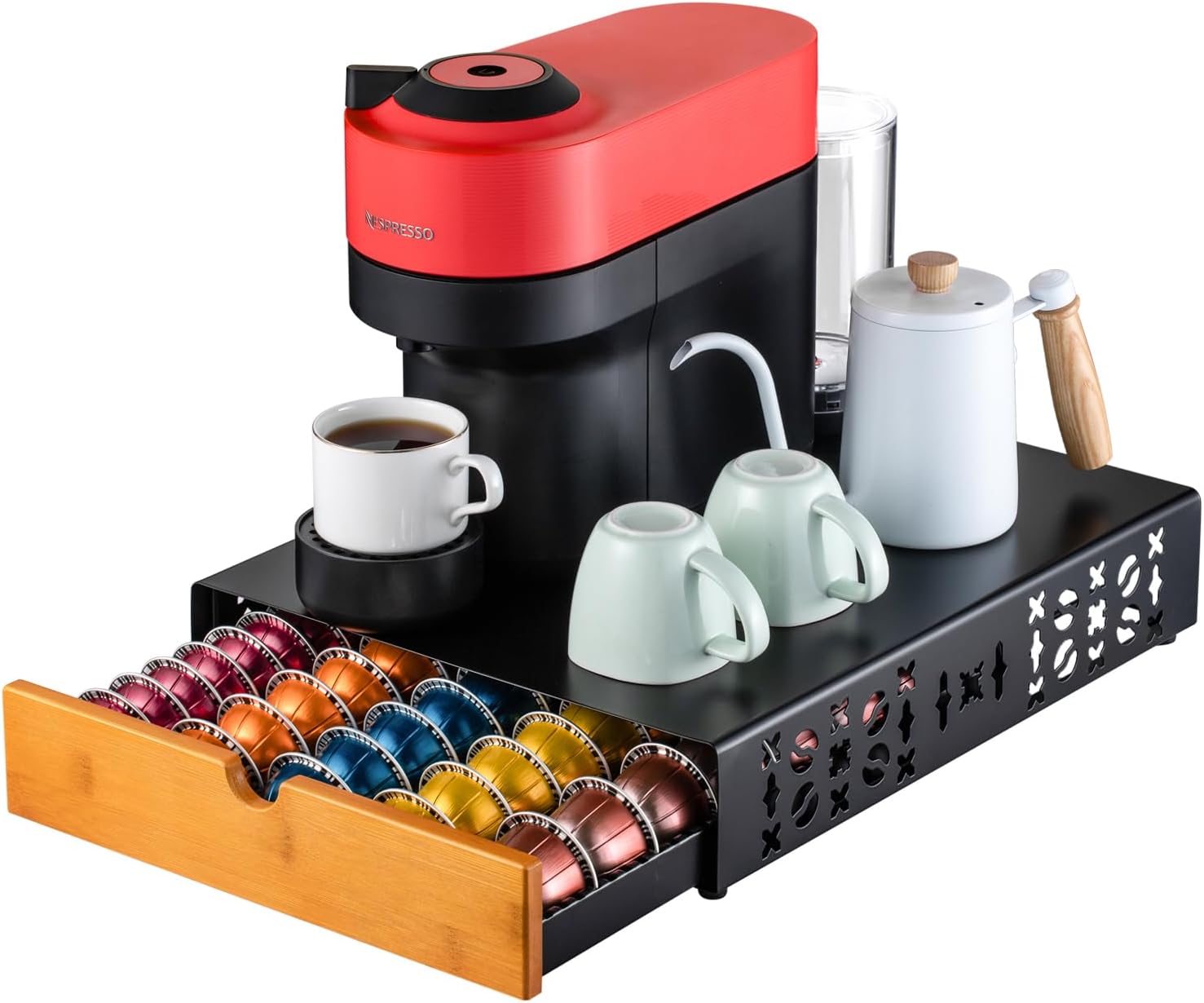- 【Ultra-Large Capacity】 Universal design drawer,Flagship's latest Pod drawer easily fits all sizes of Vertuo capsules.Maximum Capacity: (40 pods 12/18 oz) or (55 pods 7.8/5/2.7oz) or (80 pods 1.35oz)