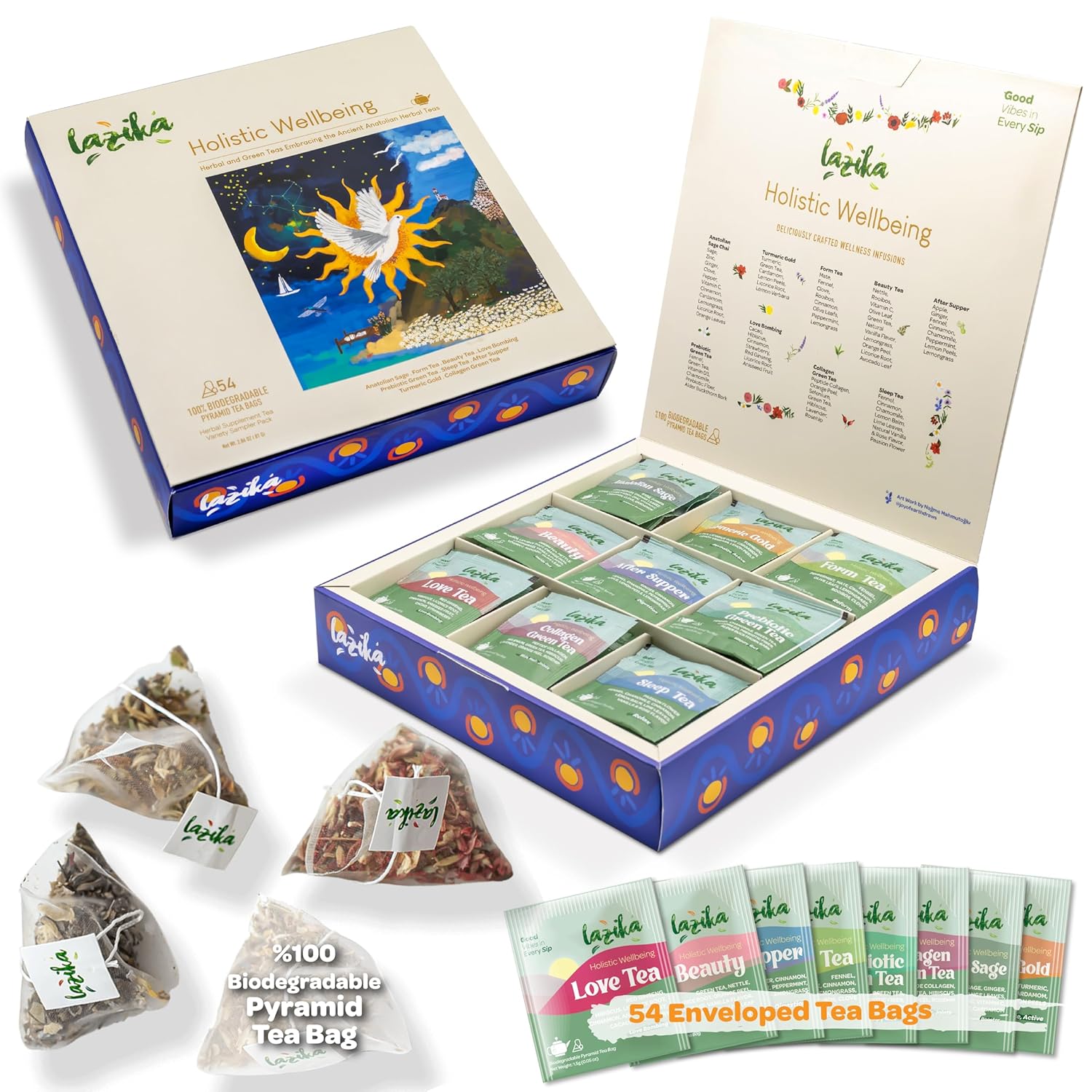 Lazika Herbal Tea Variety Pack with Lovely Presentation Box, 54 Counts, Holistic Wellbeing Tea Assortment Gift Set, Premium Collection with Pyramid Infuser Bag, Handcrafted